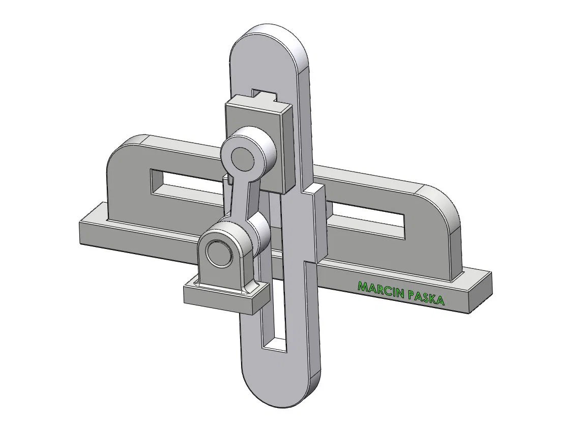 Mô hình cơ cấu slider-crank gồm slider trượt theo đường thẳng và crank quay quanh điểm cố định. Dùng để biến đổi chuyển động quay thành tịnh tiến qua lại (và ngược lại), phổ biến trong động cơ piston, bơm và cơ cấu truyền động.