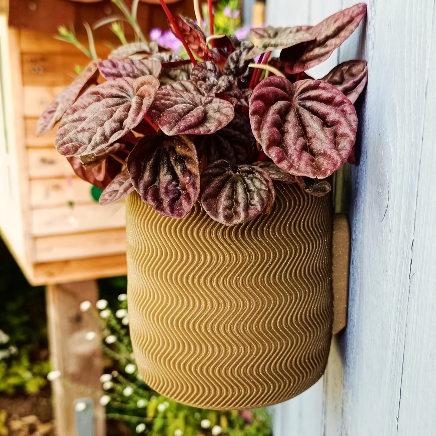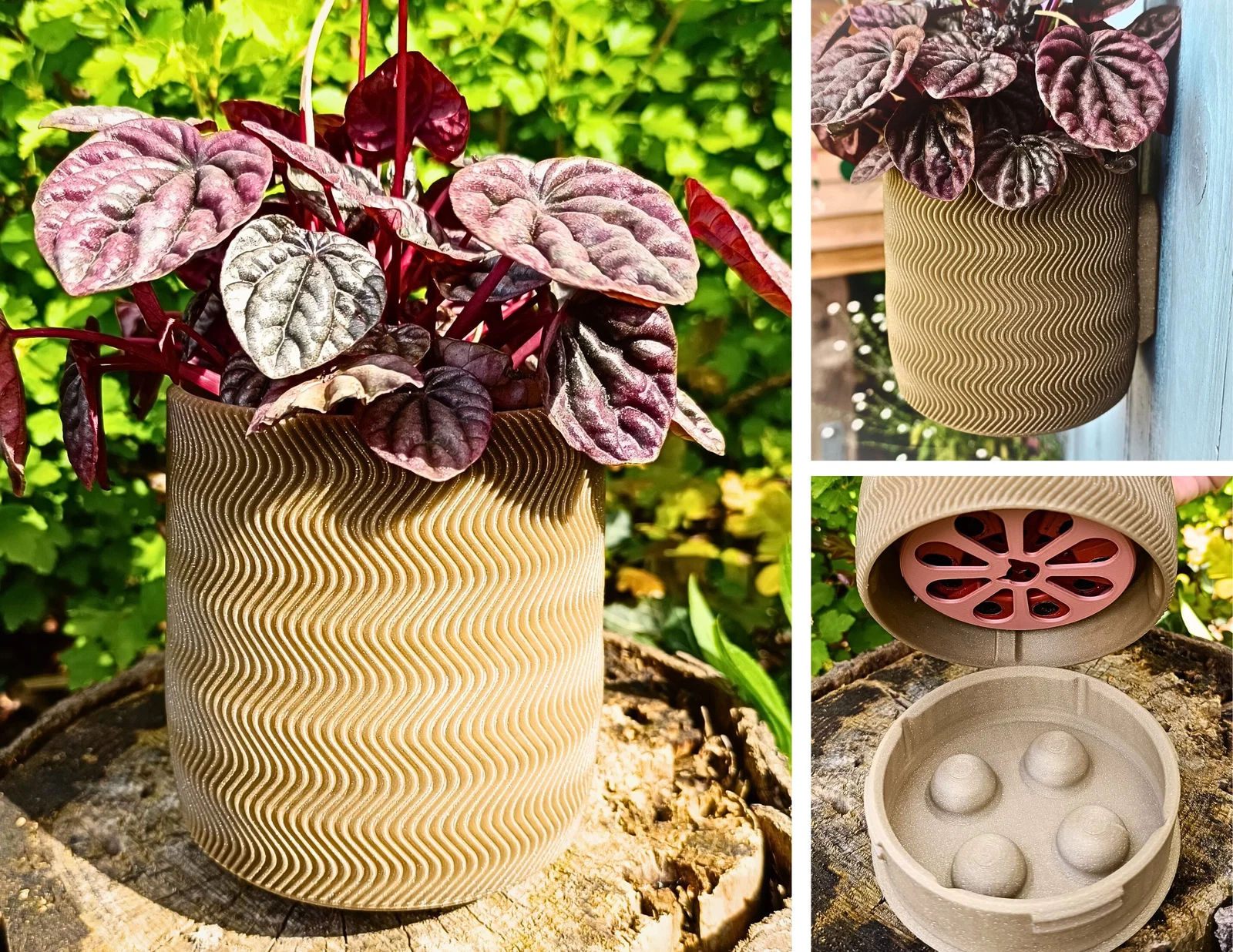 Wall Planter 1.5 là chậu trồng cây có khay hứng nước ẩn (Abtropfbehälter) và tùy chọn ngàm/giá treo tường. In 3D khá dễ, tác giả gợi ý dùng 8% Gyroid Infill. Filament dùng trong ảnh: Redline Ockergelb.