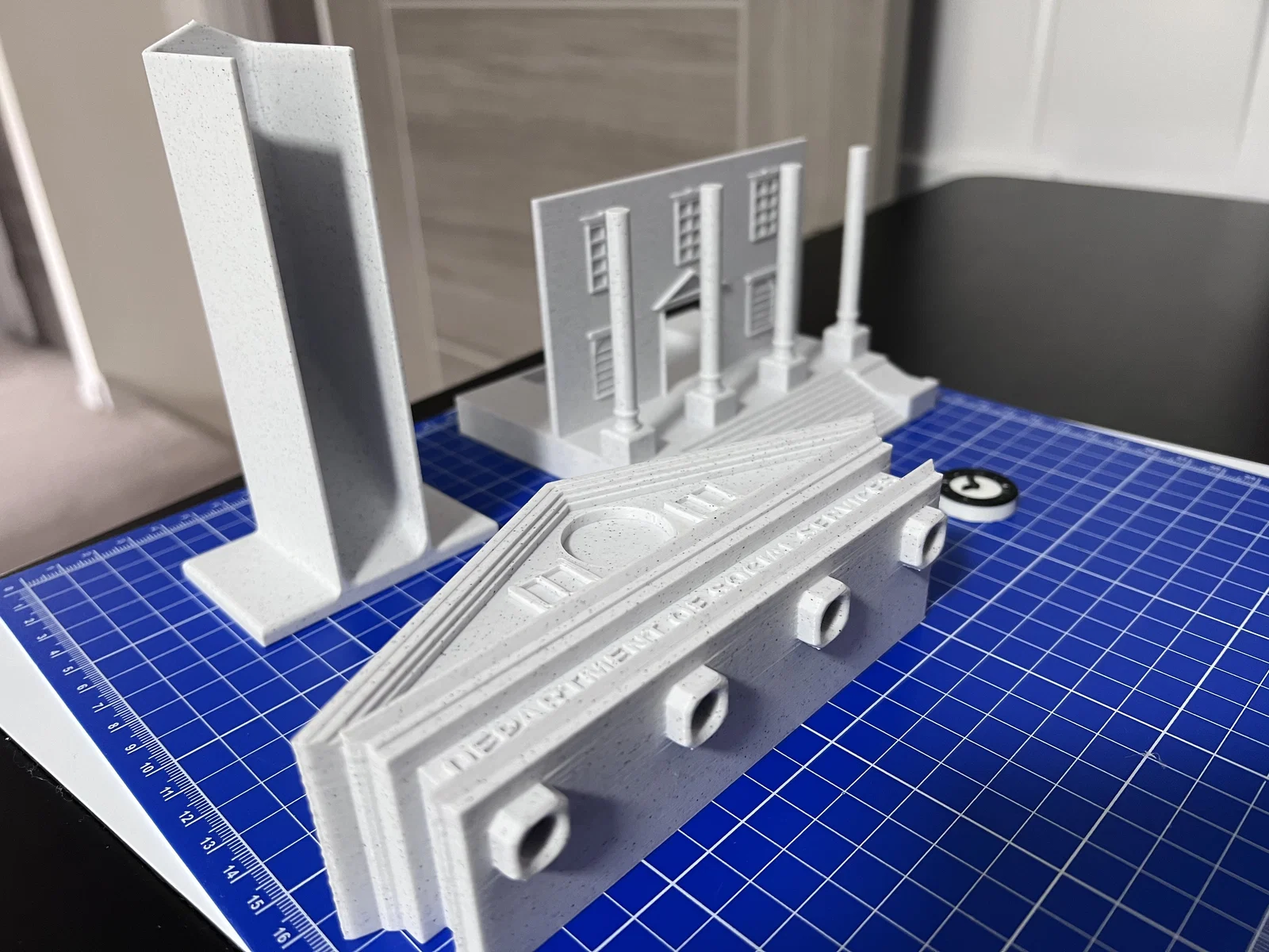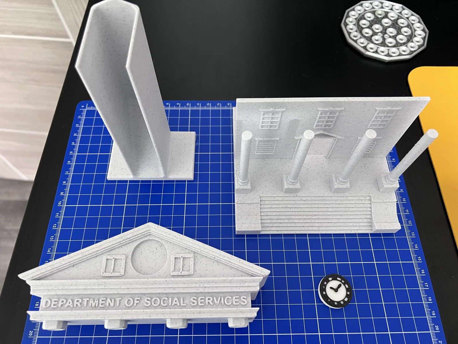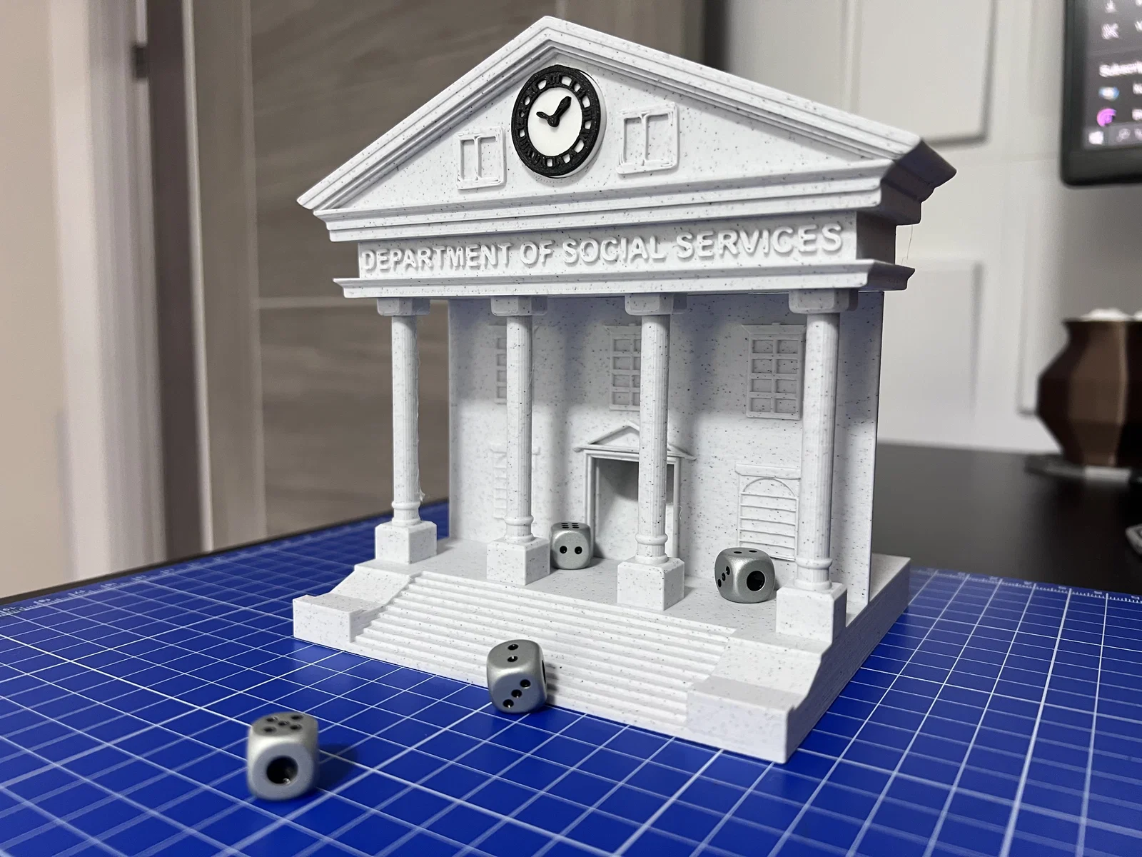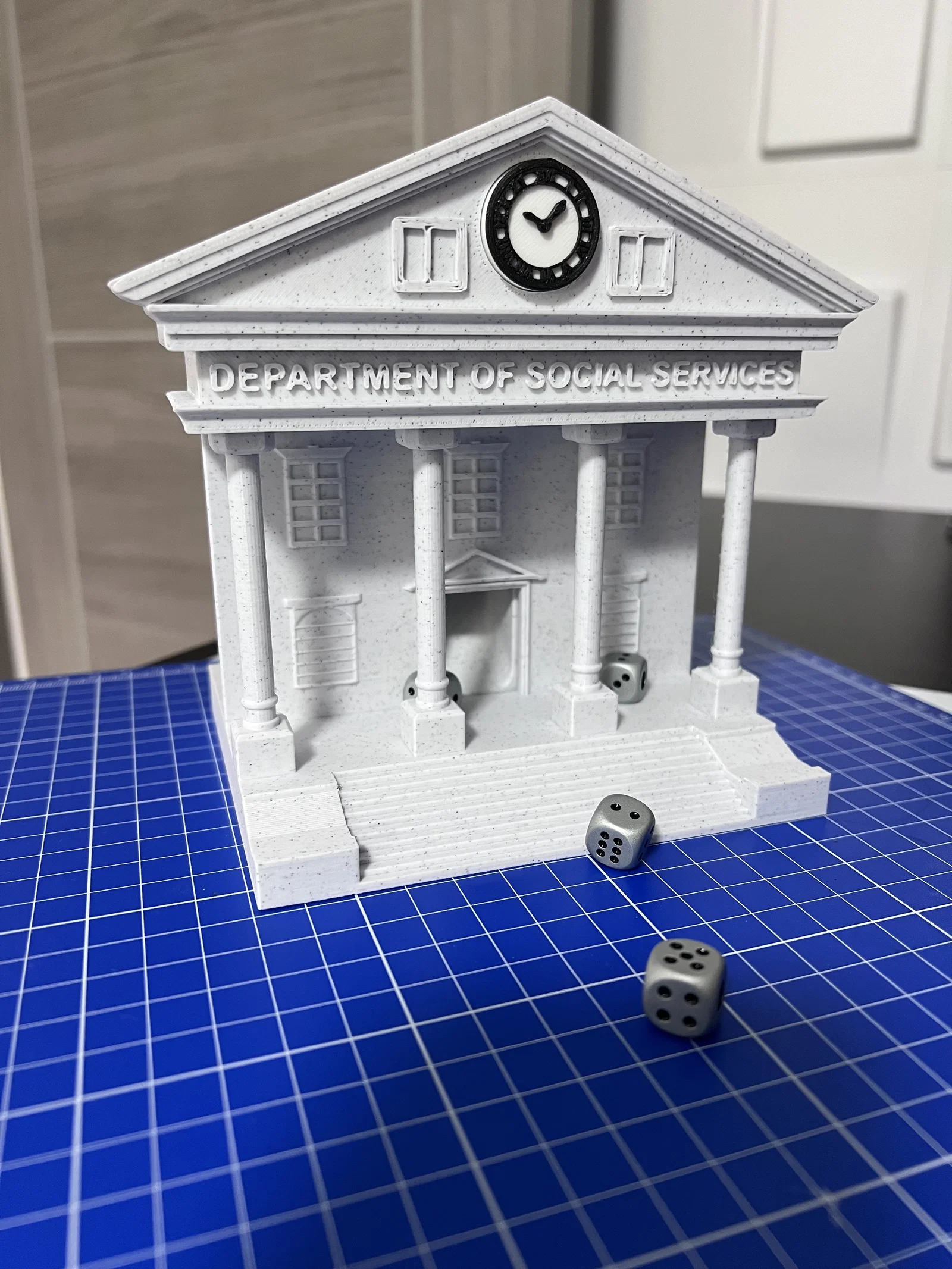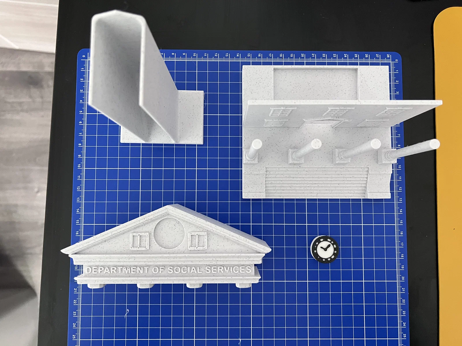 - Khuyên dùng nhựa PLA chất lượng cao để đảm bảo độ chi tiết cho các cột trụ và mặt chữ "Department of Social Services".