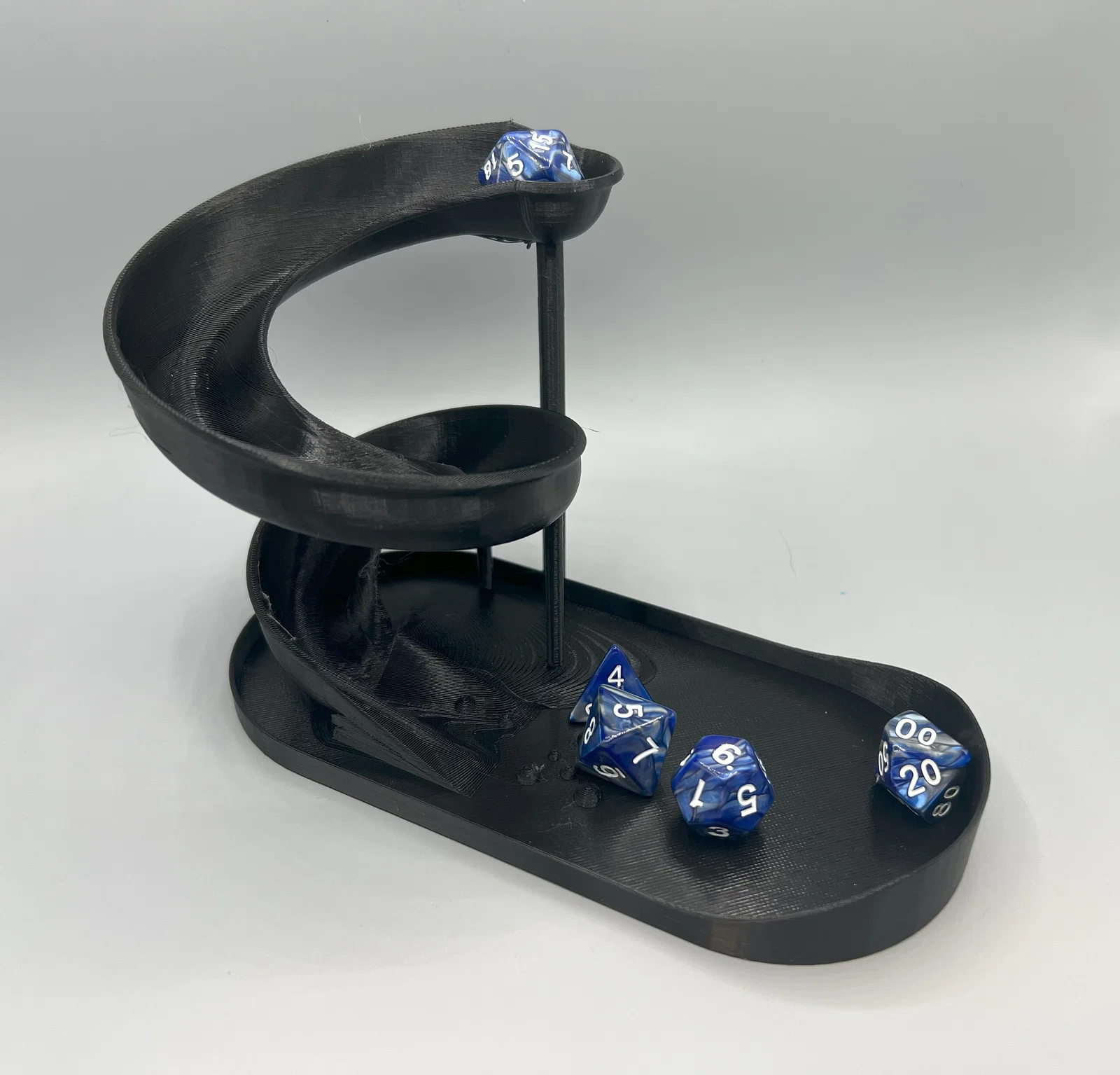 Tháp đổ xúc xắc hình máng trượt nước, cho phép nhìn rõ xúc xắc trượt xuống và lăn qua các gờ. Bản v7 dễ in hơn, ít supports và có đoạn “rumple” giúp tăng tính ngẫu nhiên khi đổ.