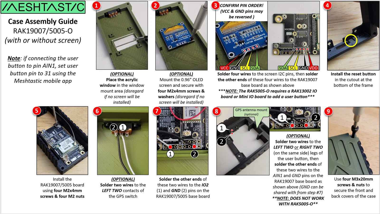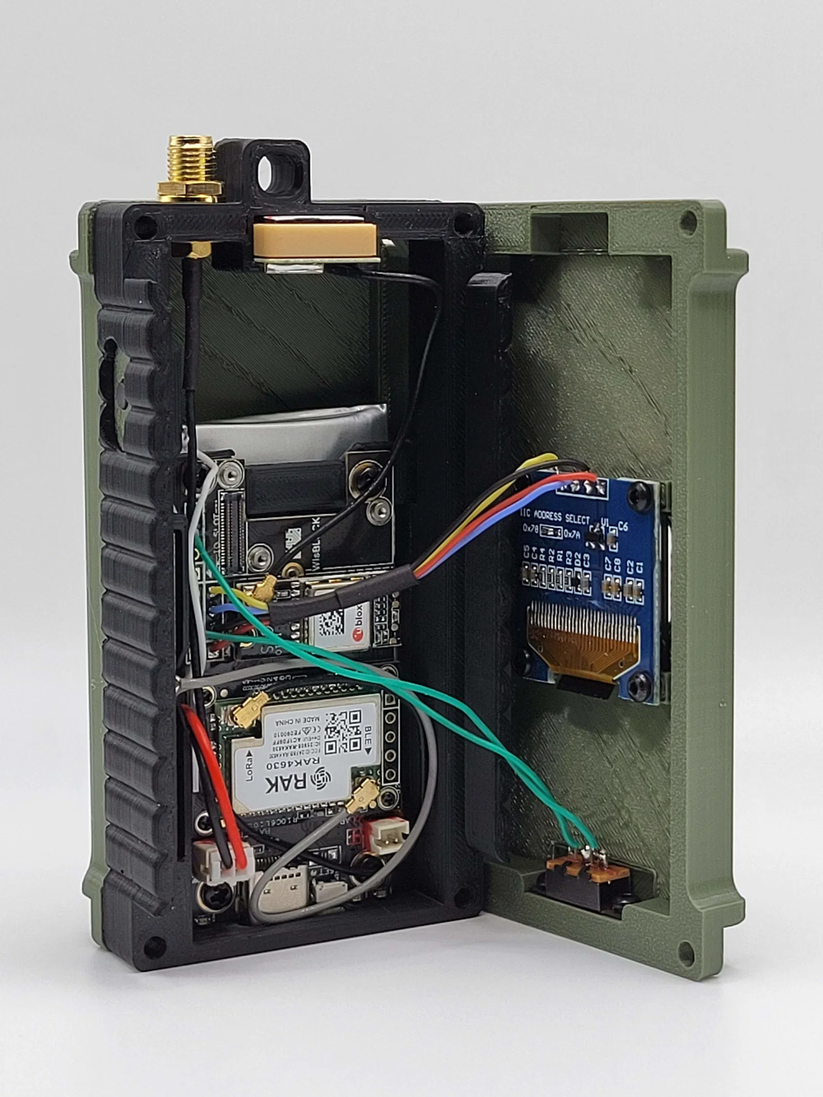 Đây là case cho bộ RAKwireless RAK19007 và RAK5005 WisBlock kits, thiết kế hướng tới dự án Meshtastic (https://meshtastic.org). Case này chứa được base board RAK19007 hoặc RAK5005 cùng các module: RAK4631 (LoRa), RAK12500/1910 (GNSS/GPS), RAK13002 (IO), và RAK18001 (piezo buzzer).