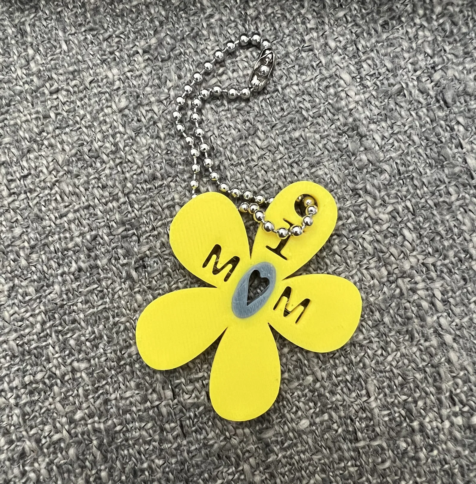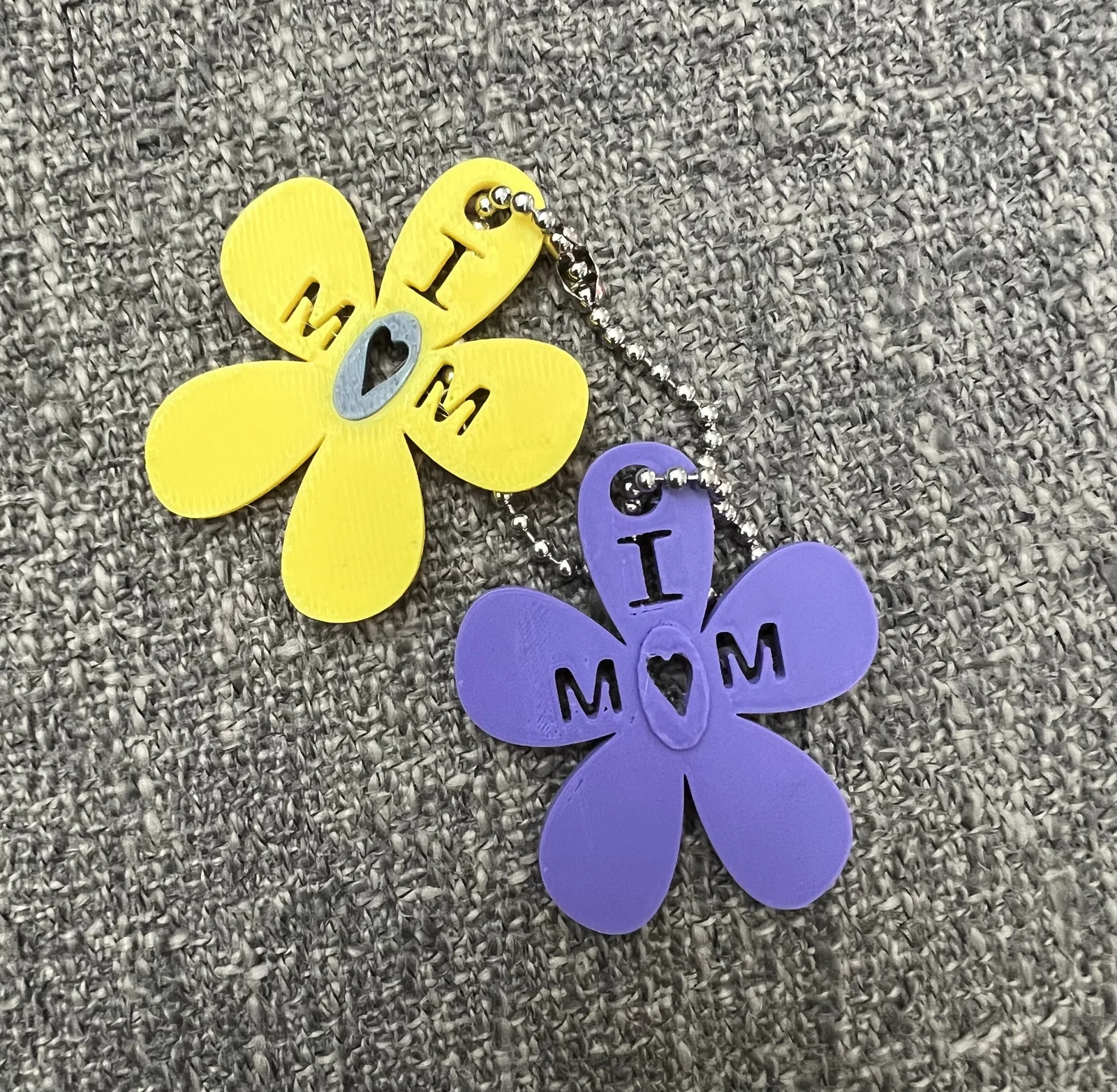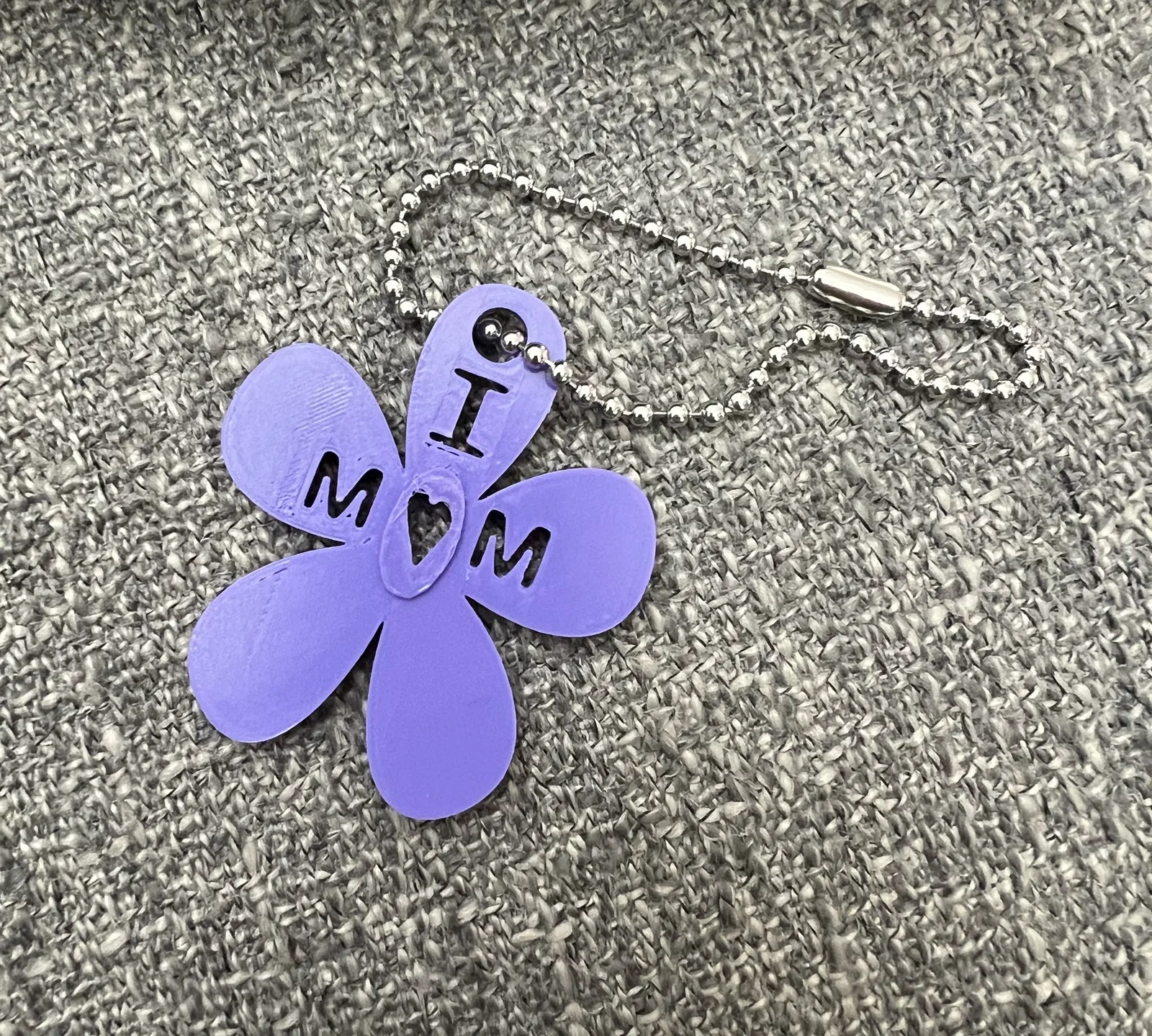 Móc khóa hoặc mặt dây chuyền hình hoa “I love MOM” để thể hiện tình yêu với mẹ trong Ngày của Mẹ hay bất kỳ ngày nào. Chữ rỗng xuyên qua nhìn được 2 mặt; có thể in 1 màu hoặc 2 màu.