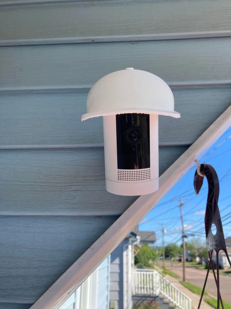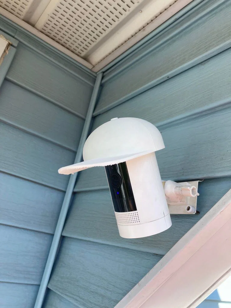 Tấm che kiểu nón lưỡi trai in 3D cho Ring Stickup Cam, giúp chặn ánh đèn hiên chiếu từ trên gây lóa, cho hình đêm rõ hơn và giữ được màu. Gồm 2 file STL: cap shade đầy đủ và sizing ring để thử vừa.