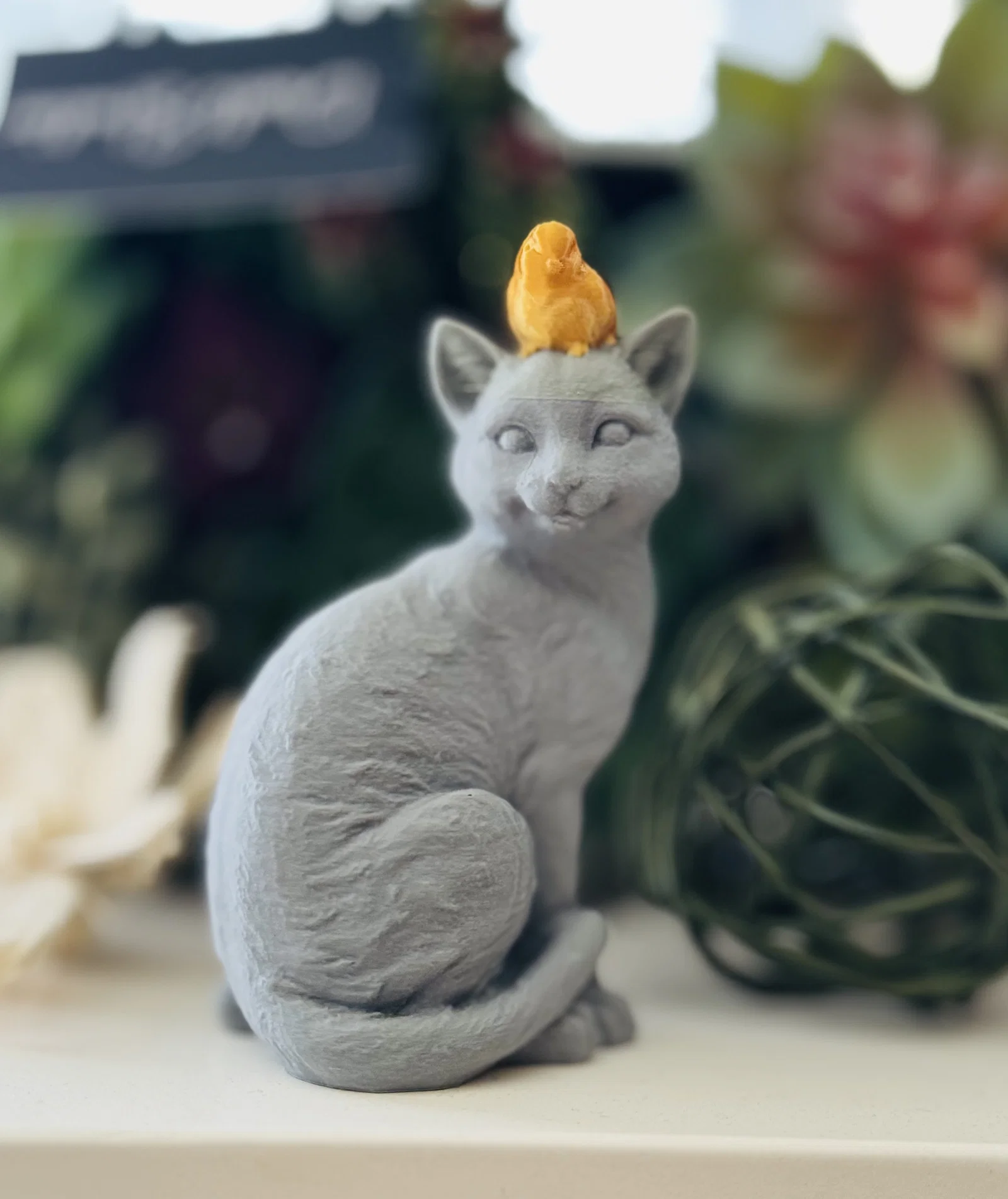 Mẫu scan bằng Poly.cam của cảnh chú chim đậu trên đầu mèo. Tác giả thấy chất lượng scan ra rất ổn nên chia sẻ cho mọi người, kèm link Etsy, TikTok và trang Polycam để xem thêm các bản scan.