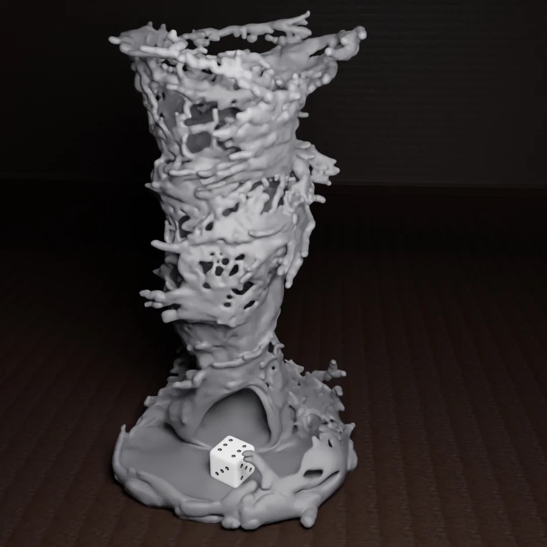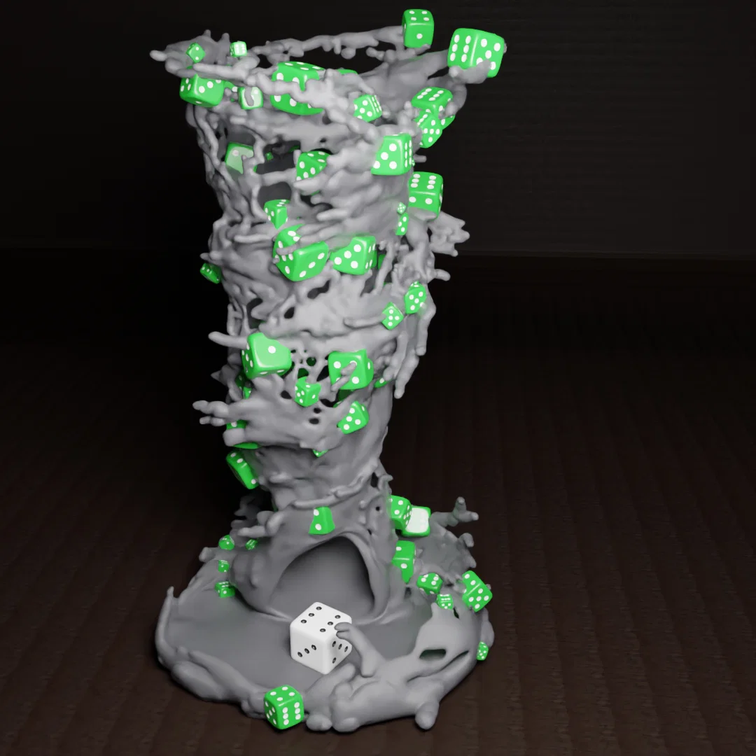 Impossible Dice Tornado Tower là tháp gieo xúc xắc có hình cơn lốc xoáy đang “hút” nhiều viên dice. Tác giả chia sẻ bản tower lốc xoáy và bản kèm xúc xắc, chưa chắc phần nào cần cho in multi material.