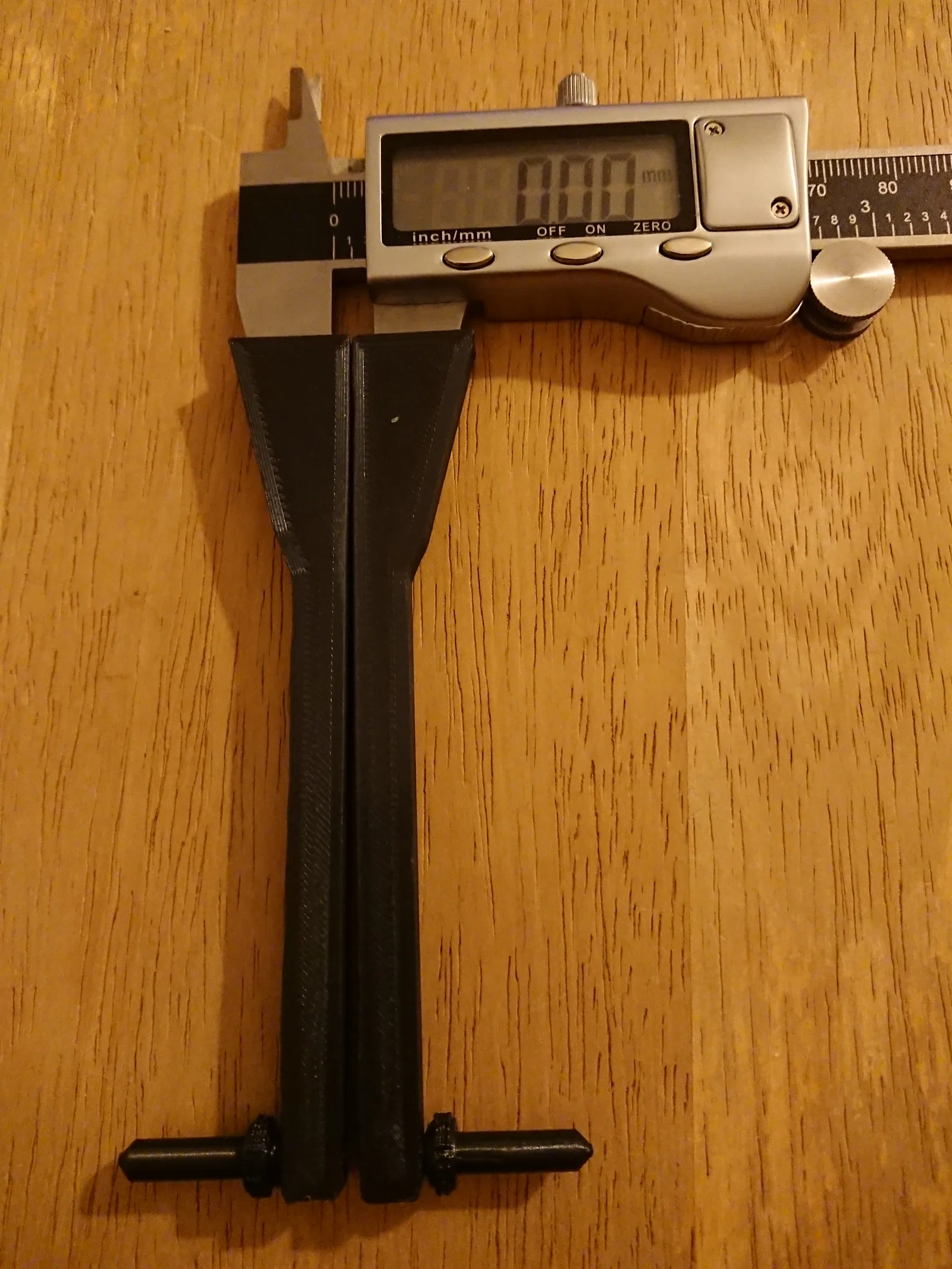 Món này giúp bạn đo kích thước bên trong hoặc bên ngoài của một vật. Độ chính xác sẽ thay đổi tùy theo độ dài của phần extension của calipers và độ dài của pin. Khi đo ngoài thì thường khá ổn, ví dụ khoảng +/-0.05mm vì bạn có thể zero calipers. Nhưng khi đo trong (hai pin hướng ra ngoài) thì có thể lệch hơn một chút vì bạn phải đo khoảng cách từ đầu pin tới đầu pin bằng thước/ruler hoặc một bộ calipers khác rồi cộng vào số đo (ở bản in của mình, hai “chân” in ra không chạm nhau ở giữa khi đóng calipers (xem hình), nên đo từ chân tới pin ở mỗi bên sẽ không đúng vì vẫn còn khe hở giữa hai chân, kiểu: đầu pin - chân - khe hở - chân - đầu pin). Dù vậy, nếu canh chỉnh/thử qua lại một chút thì vẫn có thể đạt khoảng trong vòng 0.5mm hoặc tốt hơn. Càng làm kích thước lớn thì khả năng chính xác sẽ giảm. Nhưng khi cần số đo thì vẫn còn hơn không.