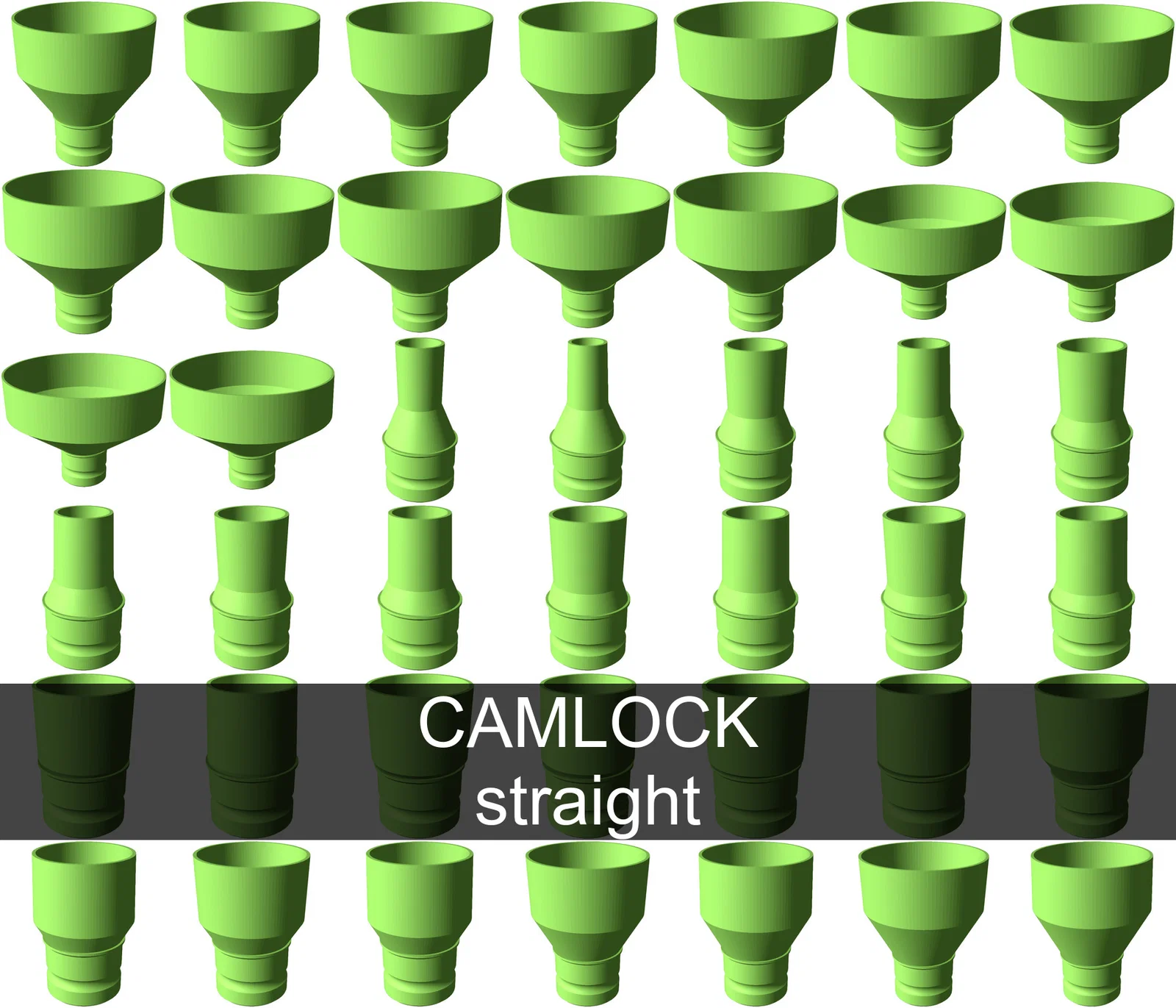 Bộ sưu tập hơn 400 adapter male cho hệ CAMLOCK (theo thiết kế PeterH) để nối ống hút bụi: hose adapters (OD/ID), đầu nối PVC mềm có barbs, và nhiều kiểu nozzle với góc thẳng/30°/45°.