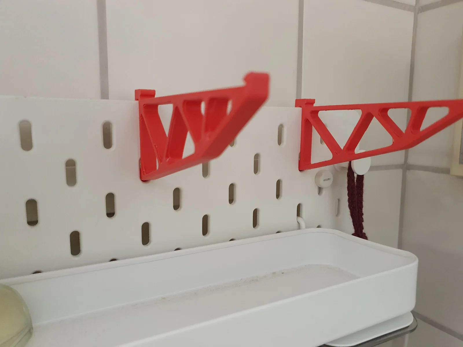 Bracket dành cho kệ continuous của IKEA Skådis, thiết kế vươn cao hơn để kẹp được vào mép trên cùng của tấm pegboard. Lưu ý cần dời cả hai móc, nên khoảng hở phía dưới kệ sẽ giảm một chút.