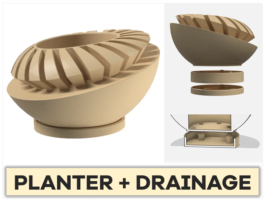 Chậu/bình hoa dạng hình học với các gân xoắn hiện đại, có lỗ thoát nước và khay hứng nước chỉnh được chiều cao theo nhu cầu tưới. Thiết kế tối ưu để in 3D không cần supports; tăng perimeters để kín nước hơn.