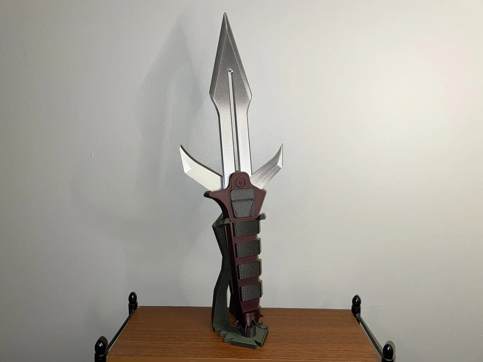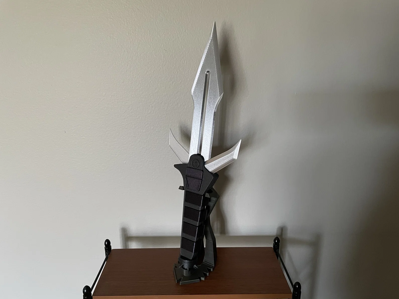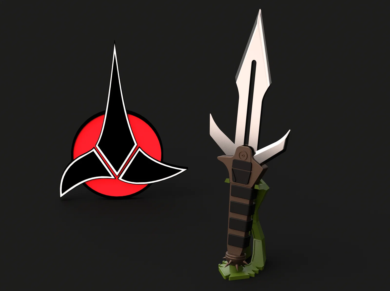 Mẫu dao Klingon D’k tahg tri-blade từ Star Trek, lưỡi phụ mở bằng cần trượt phía sau. Dùng nam châm 6x2mm để giữ lưỡi mở/đóng, không cần support. Kích thước lớn ~40cm, có kèm chân đế.