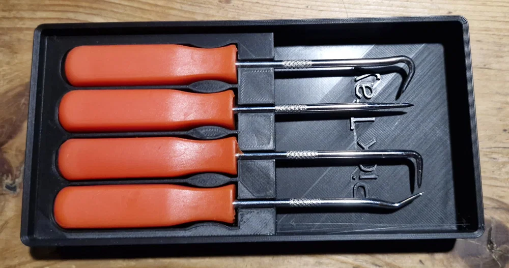 Giới thiệu Gridfinity Pick Set Bin được thiết kế cho bộ pick set. Mình mua bộ của mình ở một cửa hàng giá rẻ tại địa phương từ khá lâu rồi. Lúc tìm mẫu, mình không kiếm được phiên bản nào vừa với phần cán, vì cán của bộ này dài hơn một chút so với loại American Harbour Freight, nên mình quyết định tự thiết kế luôn.