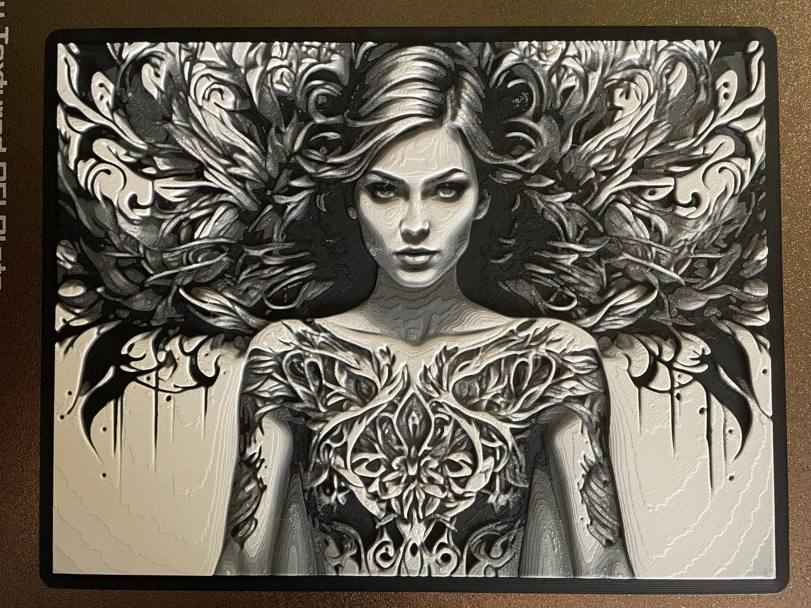 Mẫu Hueforge “Woman in Wall Tattoo Art” lấy cảm hứng từ một hình xăm từng thấy. Có thể scale X/Y nhưng giữ nguyên Z. In 100% infill, layer 0.08mm (base 0.16mm) và đổi màu PLA theo mốc layer đã hướng dẫn.