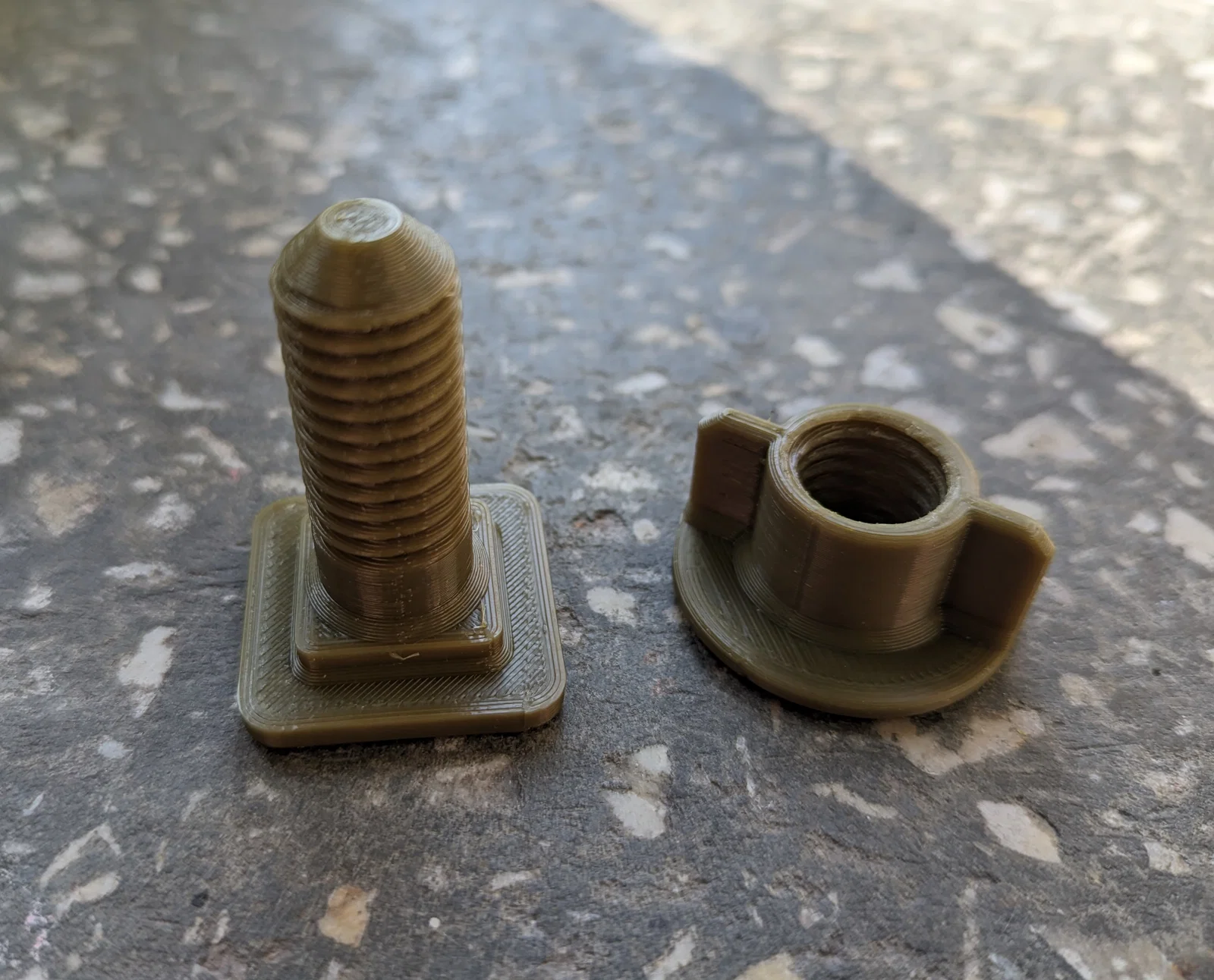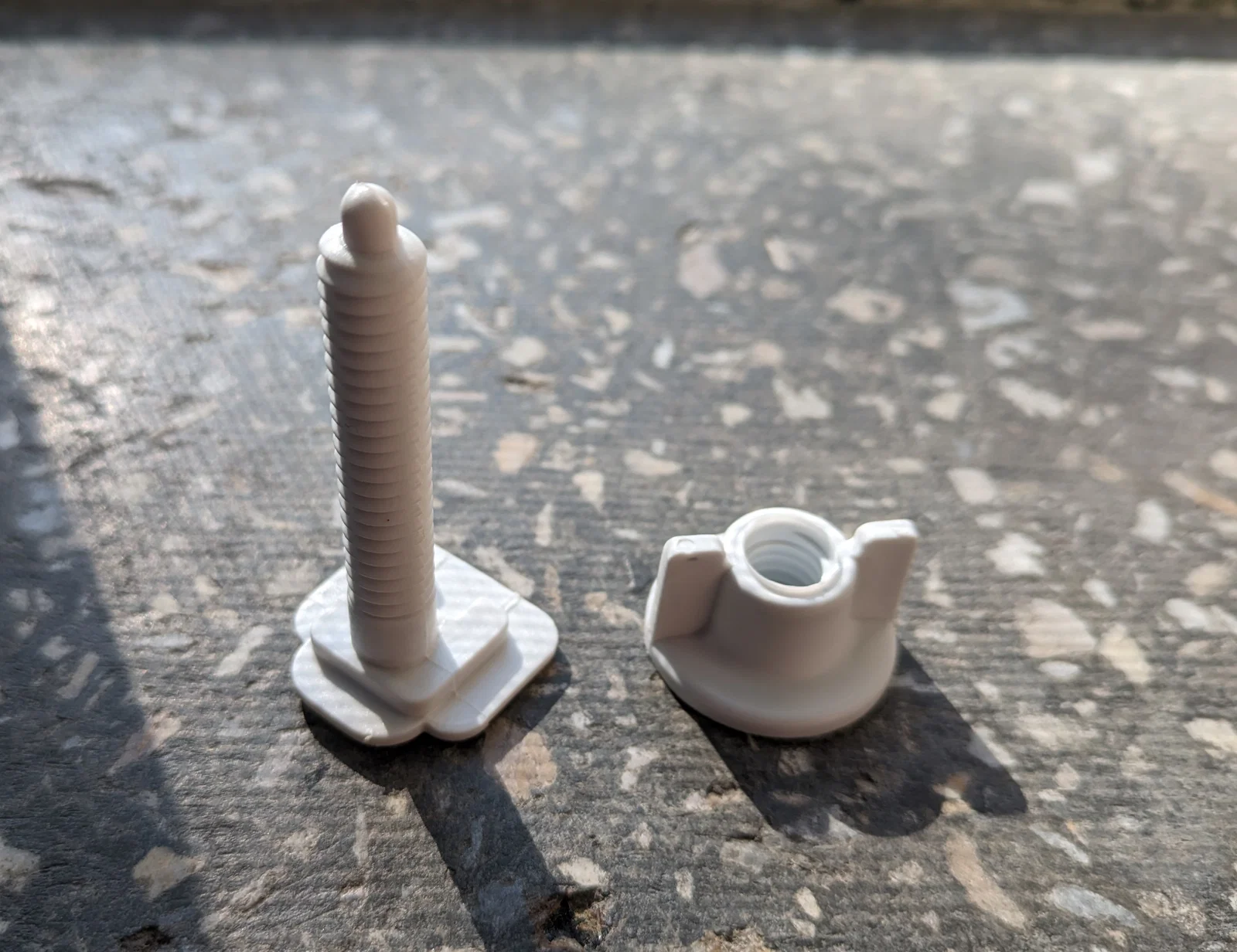 Bộ bu lông và đai ốc thay thế cho bệ ngồi toilet, được thiết kế lại cho chắc và bền hơn loại zin. Phù hợp lỗ mounting 14mm đường kính, sâu 15mm. Khuyến nghị in PETG, infill 100%.