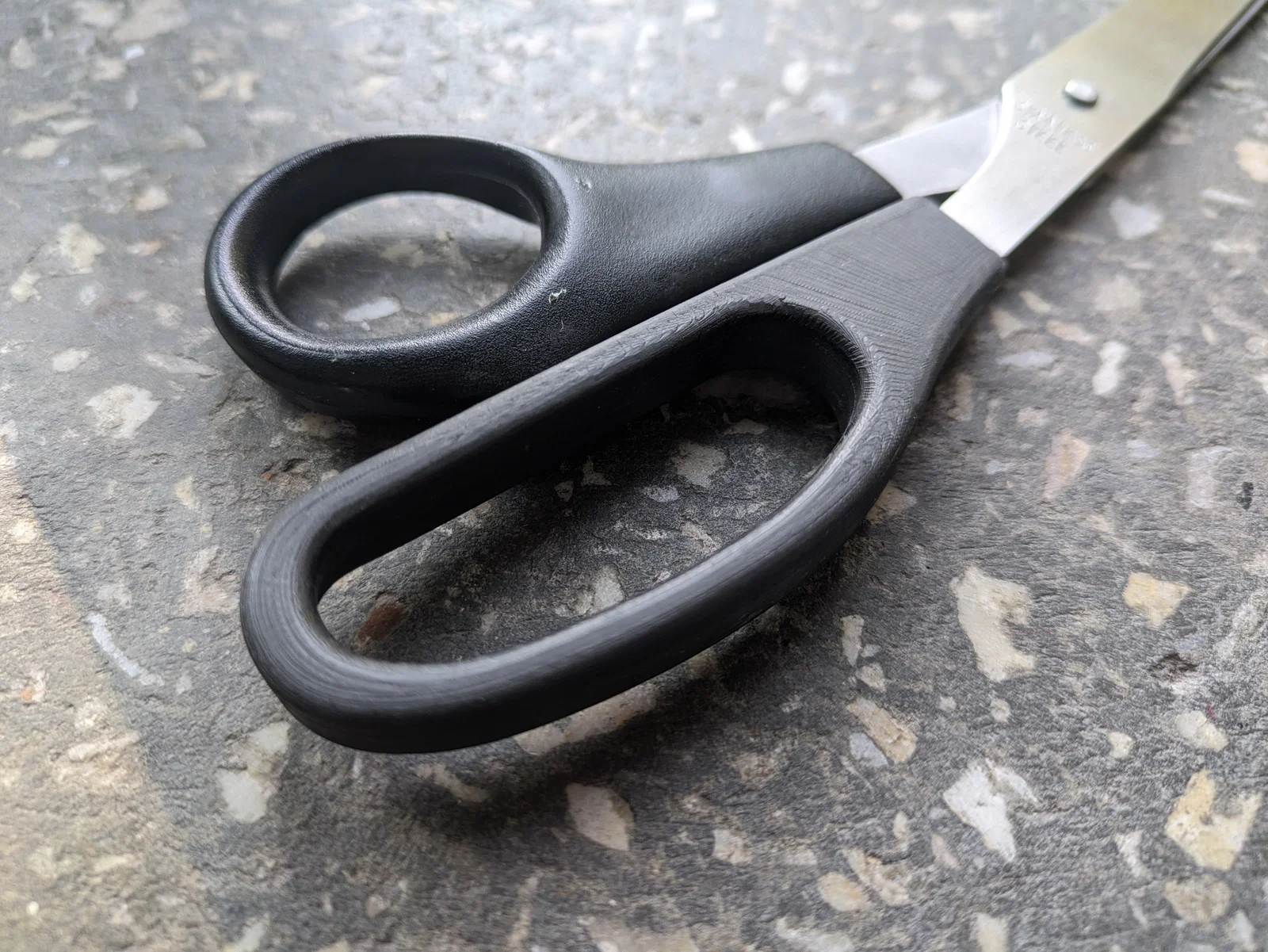 Mẫu tay cầm thay thế cho phần tay cầm lớn của kéo Buromax BM.4506 “generic”. Thiết kế dựa trên ảnh chụp phần bị gãy trong Fusion 360; lắp bằng cách hơ nóng đầu lưỡi kéo rồi press fit tay cầm vào.