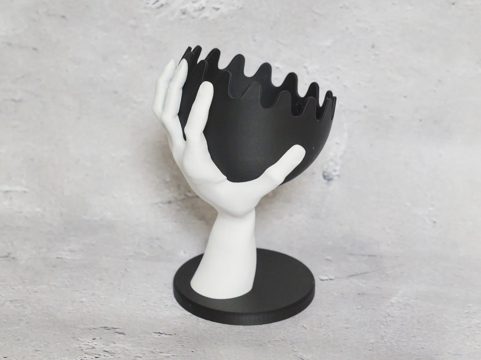 Nếu anh chị đang tìm kiếm một món đồ trang trí độc đáo, mang chút nét phá cách cho không gian làm việc hoặc kệ sách, thì mô hình "Hand bowl holder" (bàn tay giữ bát) này chắc chắn là lựa chọn không thể bỏ qua. Với thiết kế hình bàn tay cách điệu đang nâng đỡ một chiếc bát nhỏ có viền gợn sóng, sản phẩm không chỉ mang tính nghệ thuật mà còn có công năng sử dụng rất linh hoạt trong đời sống hàng ngày.