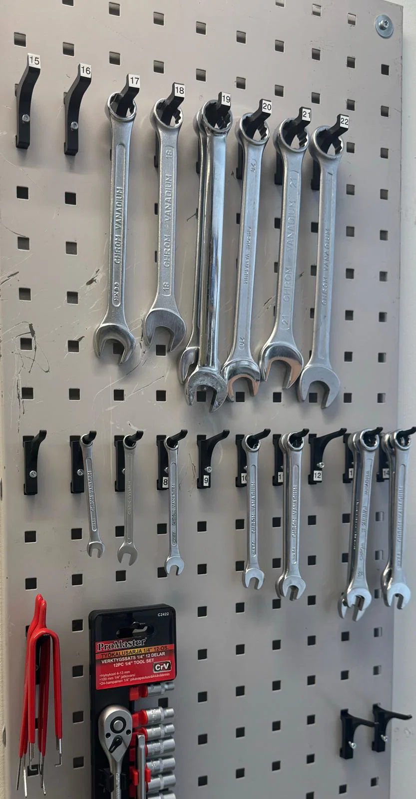 Móc gắn cho tấm perforated plate loại thường, phù hợp treo bộ cờ lê/spanner cỡ nhỏ đến trung bình. Chuẩn cho tấm board 38 mm, siết cố định bằng ốc + đai ốc M3. Gợi ý in: PETG/ASA, infill 80%+.