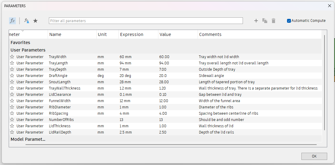 Khay diamond painting có nắp trượt. Bằng cách dùng các user parameters trong file F3D (F360) đi kèm, bạn có thể chỉnh sửa cái khay này dễ dàng theo vô số kiểu và thích nghi cho nhiều mục đích khác nhau. Nó cũng có thể dùng làm hộp lưu trữ linh kiện/chi tiết nhỏ rất tiện.