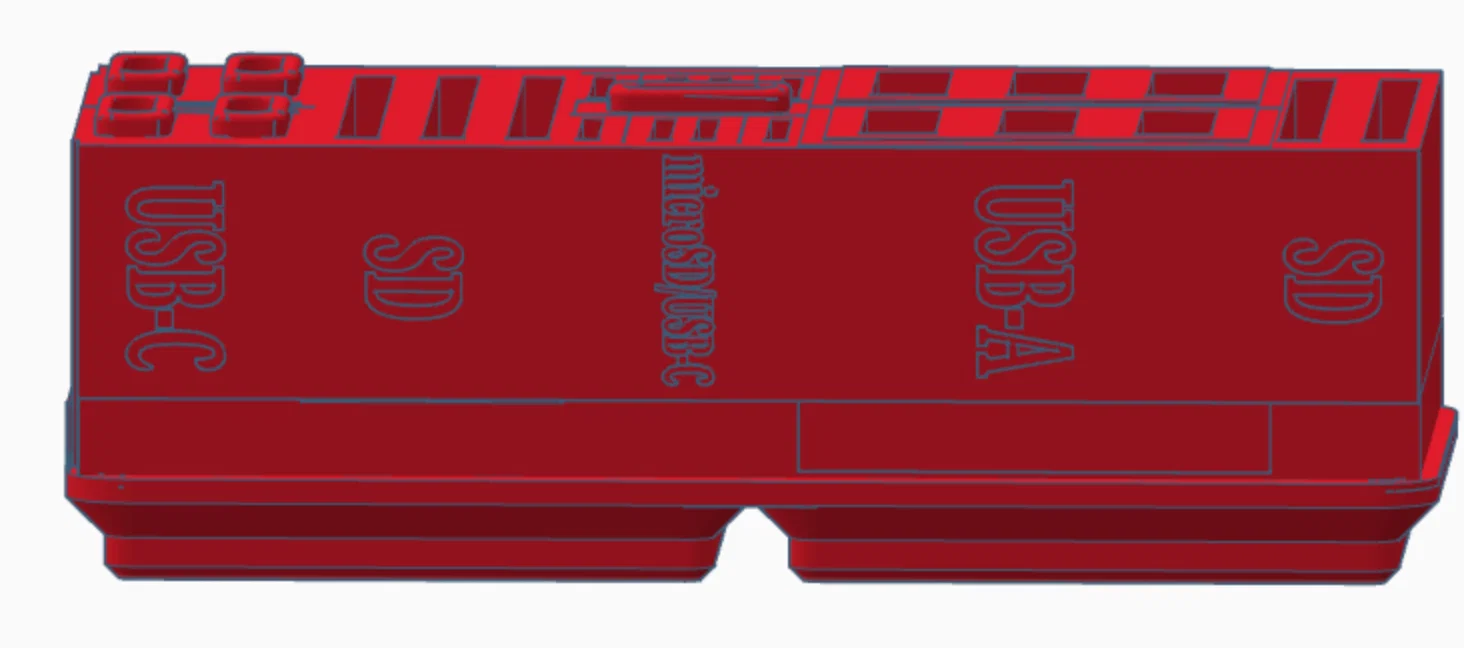 Món này dùng để sắp xếp gọn mấy sợi cáp và đồ lưu trữ linh tinh đang nằm vương vãi trên bàn của bạn. Nó có: 5 khe USB-C, 10 khe microSD, 5 khe SD, và 6 khe USB-C. Nó sẽ chiếm 2 ô Gridfinity, và dùng nam châm chuẩn 6x2mm. Có tuỳ chọn bản có nhãn và không có nhãn.
