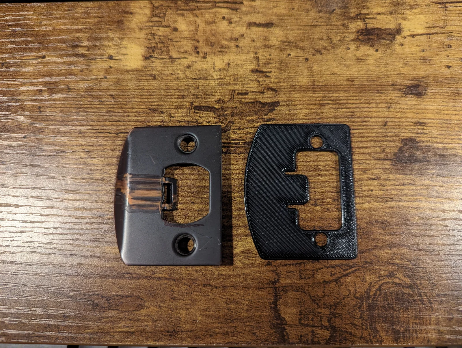 Mình cần chỉnh lại miếng strike plate (ốp chốt cửa) do nhà bị lún/settling theo thời gian. Thay vì phải giũa bớt mấy miếng kim loại đã lắp sẵn, mình quyết định làm một mẫu có thể bẻ/bo theo đúng vị trí cửa bằng heat gun.
