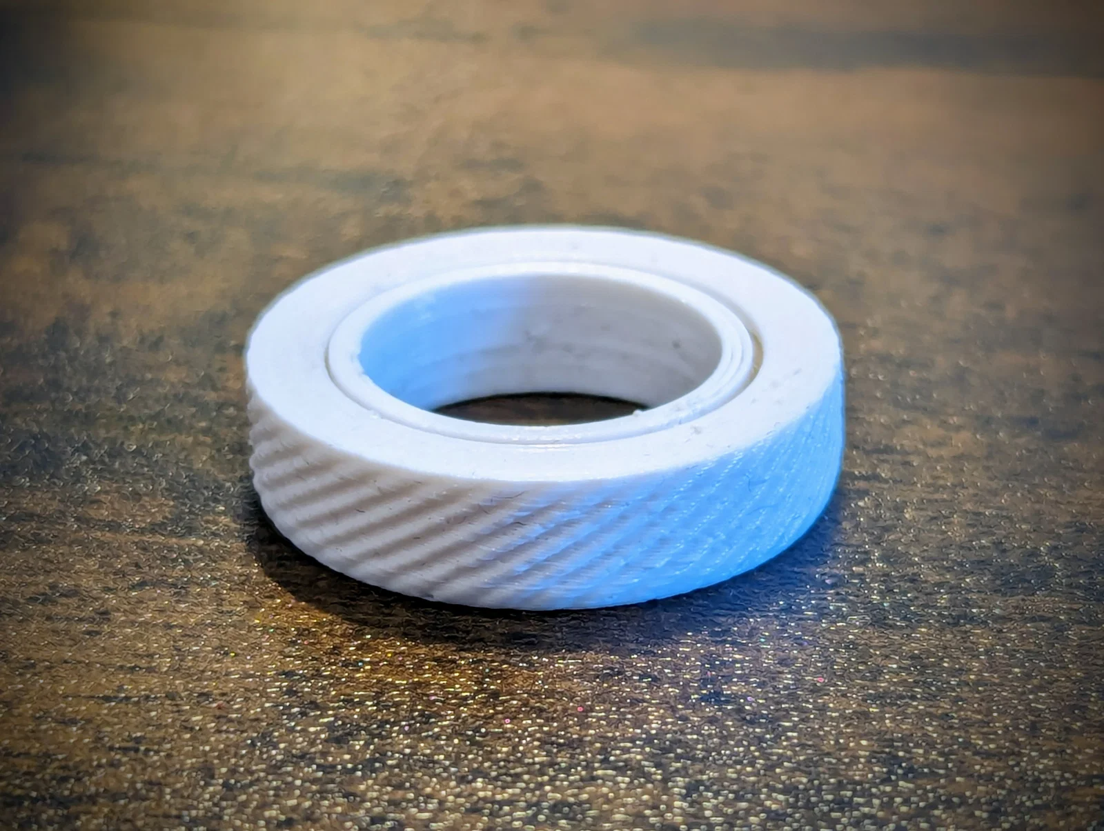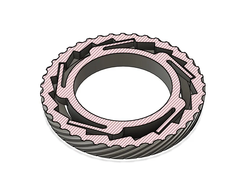 Chiếc nhẫn có cơ cấu ratchet để tạo tiếng click và có thể in liền khối (print-in-place). Đường kính trong là 18mm, nhưng mình có kèm file CAD dạng parametric cho nhiều cỡ ngón tay khác nhau.