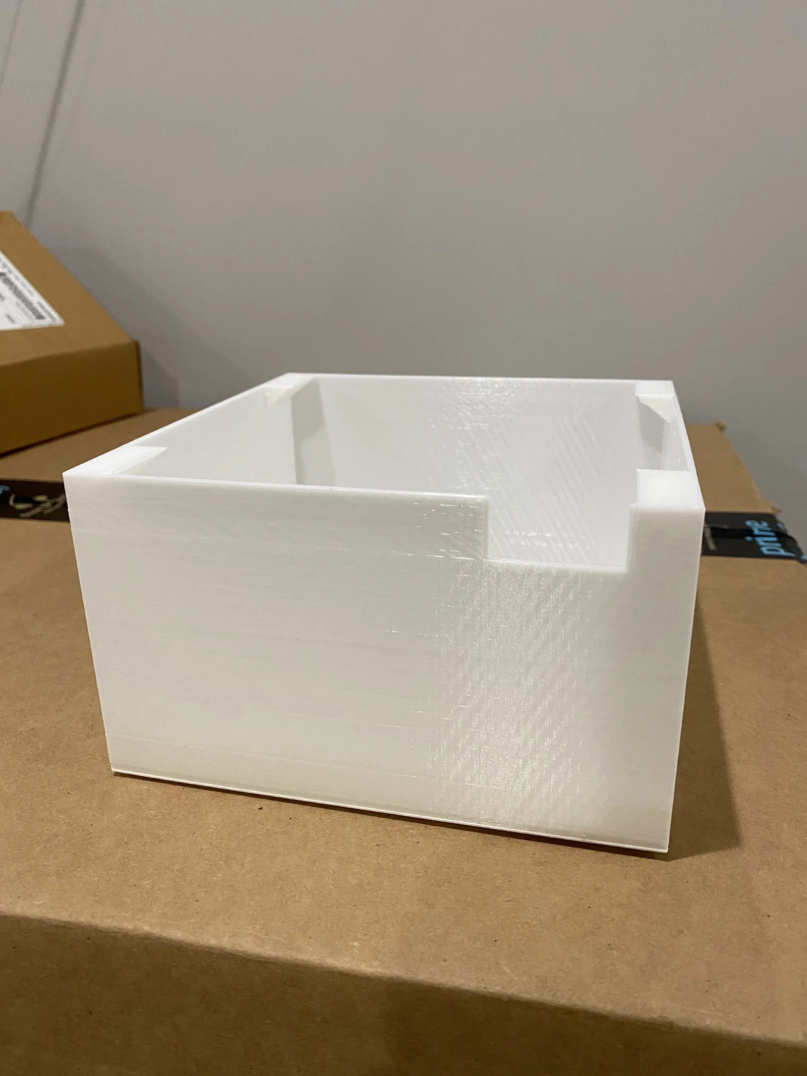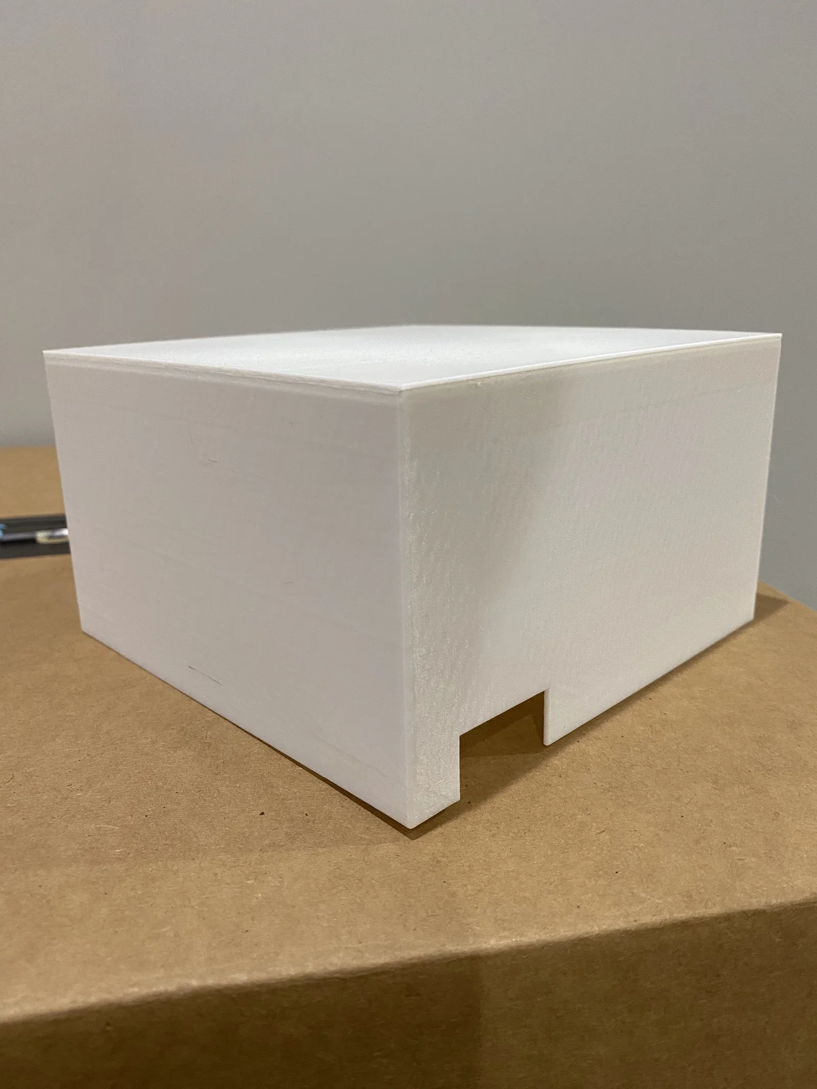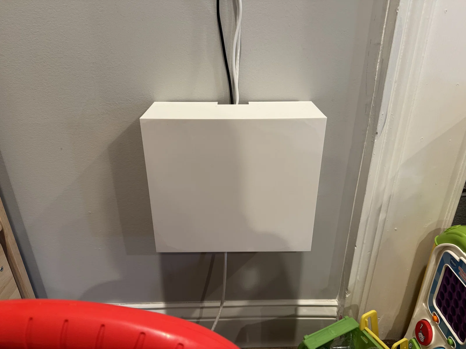 Khi mình thử luồn dây qua tường tầng hầm, mình phát hiện có vài thanh đà ngang (horizontal studs) chặn mất đường để đi dây theo phương dọc bên trong tường. Vì vậy mình mua mấy máng/kênh sắp dây (cable organizer channels) và thiết kế cái hộp đơn giản này trên Tinkercad để chụp lên ổ điện 2-gang của mình. Mẫu có 4 ngàm để dán thêm command strips loại nhỏ, nên không cần khoan lỗ lên tường.