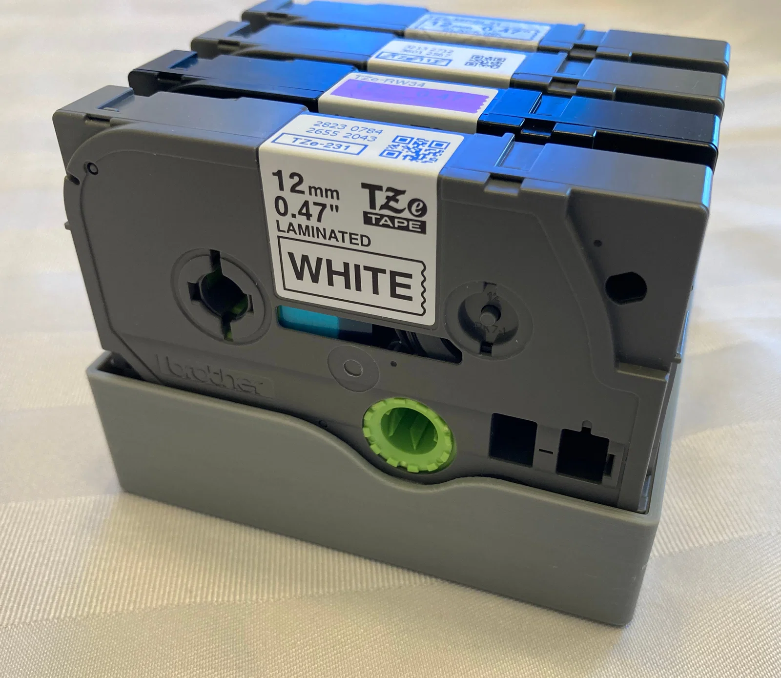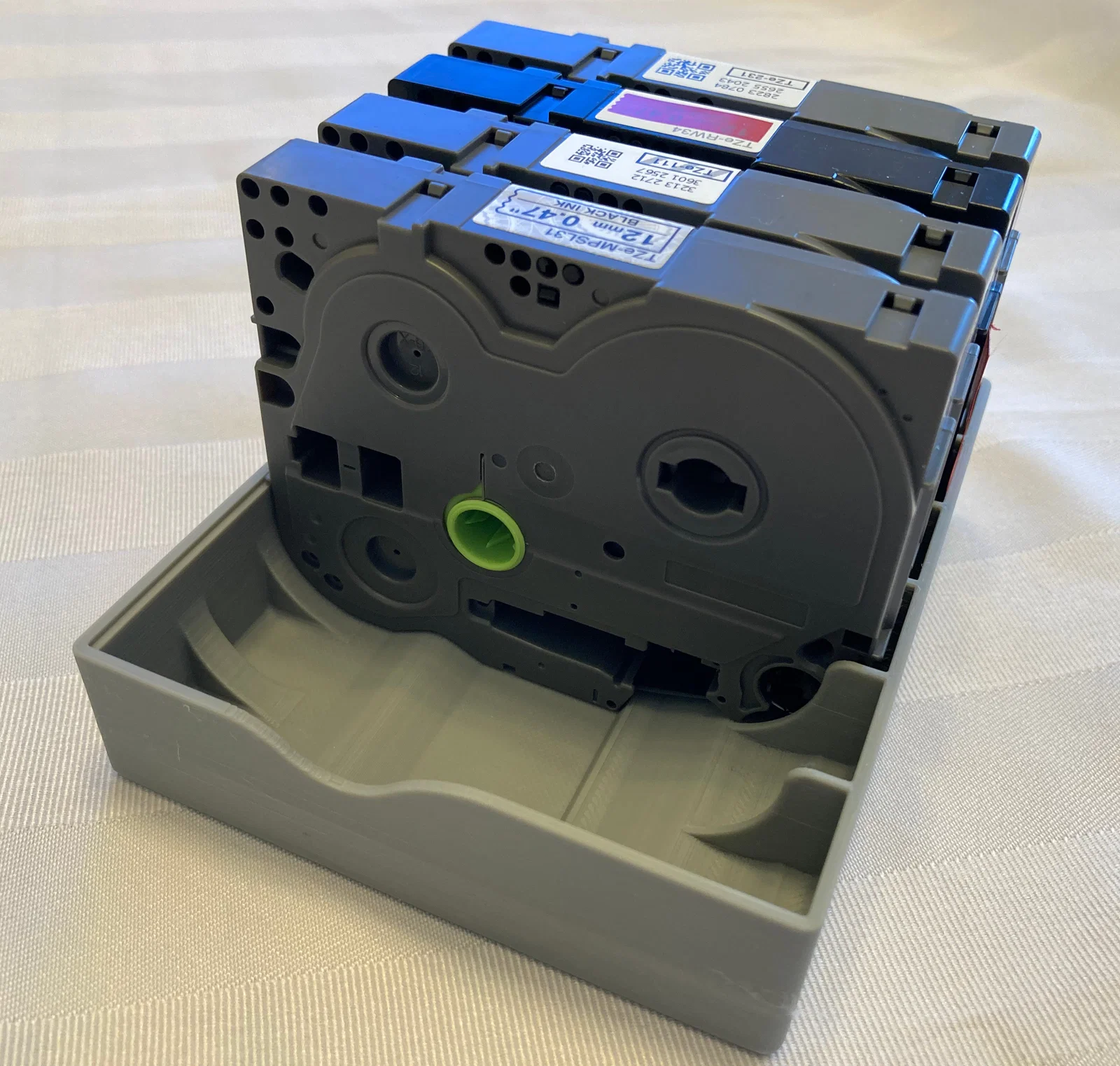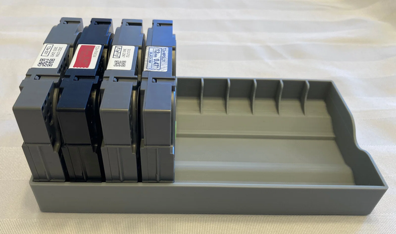 Khay đơn giản để xếp và giữ các cassette nhãn Brother P-Touch TZe. Có biến thể “standard” (6-cart/10-cart) và “curvy”; khuyến nghị in layer height 0.1 mm và dùng “test fit jig” để kiểm tra độ vừa.