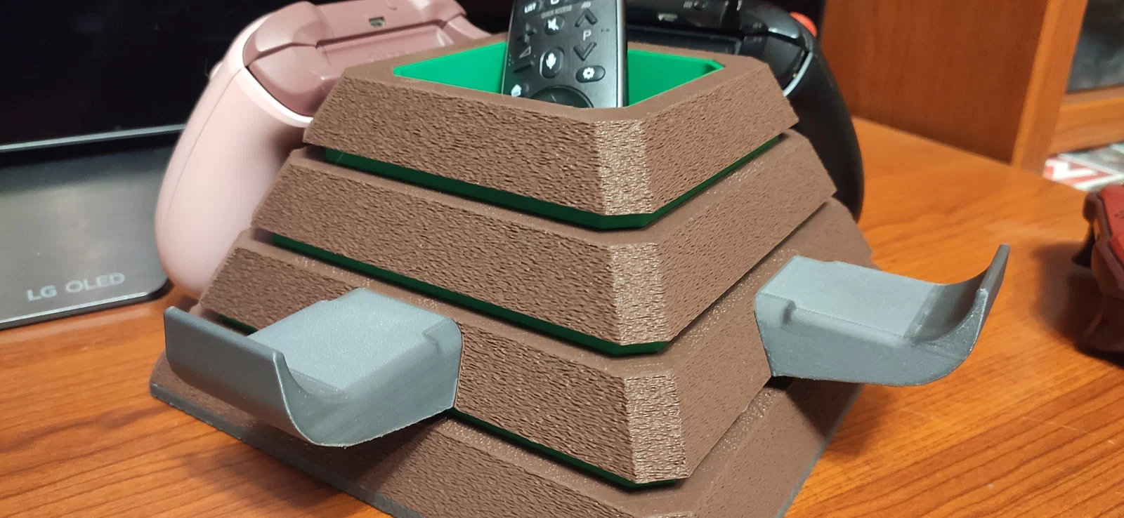 Giá đỡ Console Controller Stand để sắp gọn 4 tay cầm, kèm insert giữ remote TV, Wii controller hoặc đồ khác. Có tuỳ chọn fuzzy skin, file 3mf chống warping và gợi ý phối màu cho từng STL.