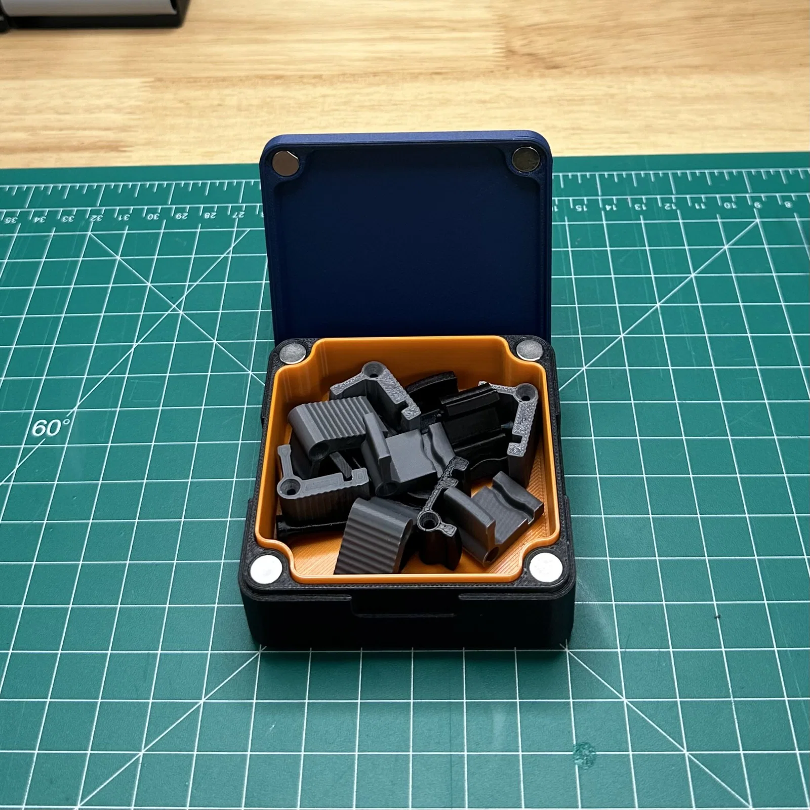 Bản re-design từ mẫu trước đó của mình, nhằm khắc phục một số điểm chưa ổn của bản gốc. Phần gờ (lip) được đảo lại để bên trong hộp không còn cái “kệ” khiến đồ dễ bị mắc kẹt. Lần này dùng nam châm lớn hơn (8mm) để giữ nắp chắc hơn, đồng thời tinh chỉnh tolerance và khoét rãnh (cutouts) tốt hơn để hạn chế keo bị tràn ra ngoài. Cũng có một insert tuỳ chọn giúp bạn in hộp bằng bất kỳ vật liệu nào mà vẫn bảo vệ phần nội thất bên trong. Trên nắp có thêm các rãnh (notches) khớp với chân đế để các hộp có thể xếp chồng và đứng yên đúng vị trí.