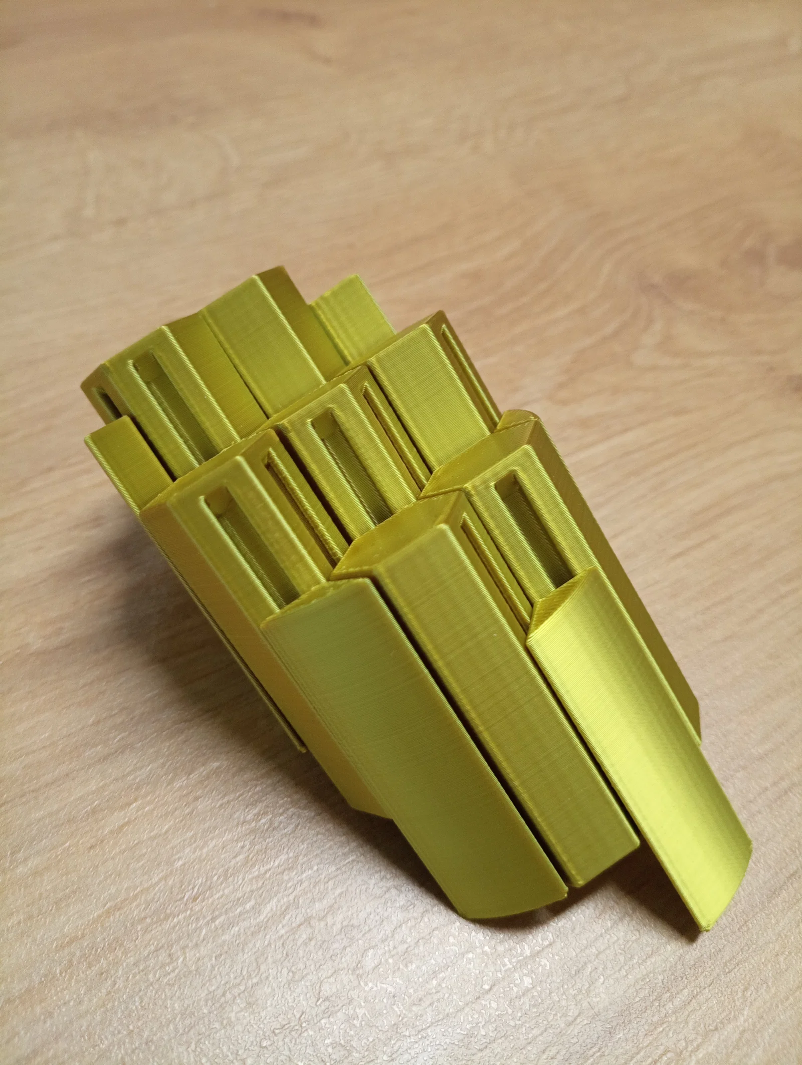 Mẫu trong hình được in bằng máy Bambu Lab P1P. Trọng lượng xấp xỉ (15% infill, layer 0.2mm) là 60g. Thời gian in khoảng 3 giờ. Dùng Golden Silk PLA Filament.