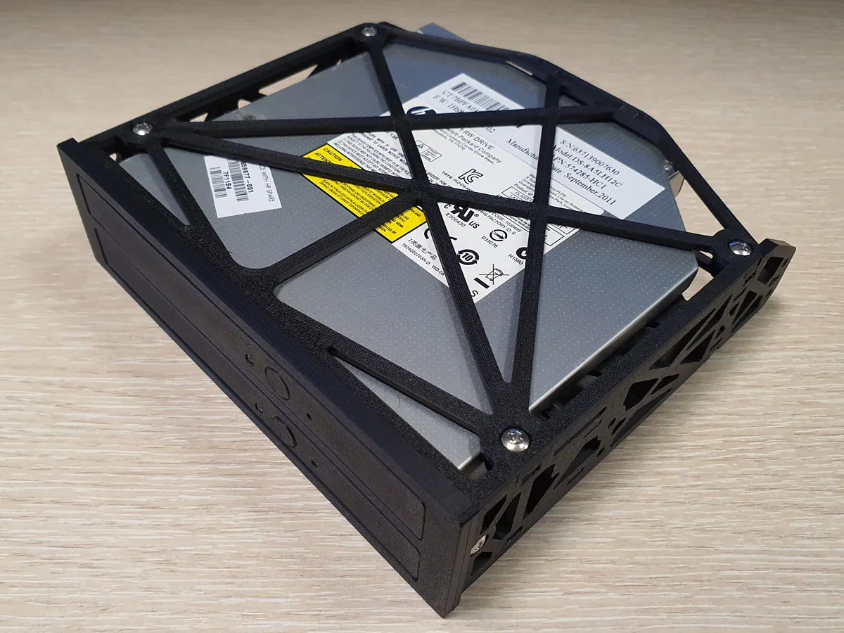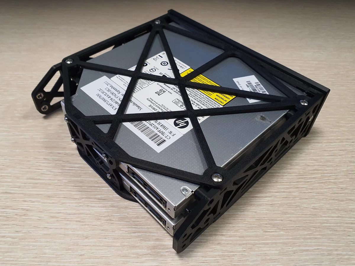 Khung để gắn 2 ổ DVD/CD/BluRay dạng slim (ODD) vào khoang PC 5.25" tiêu chuẩn. Có danh sách ốc/đai ốc cần chuẩn bị, file STL cần in và hướng dẫn lắp ráp; có thể cần tinh chỉnh tùy từng model ổ.