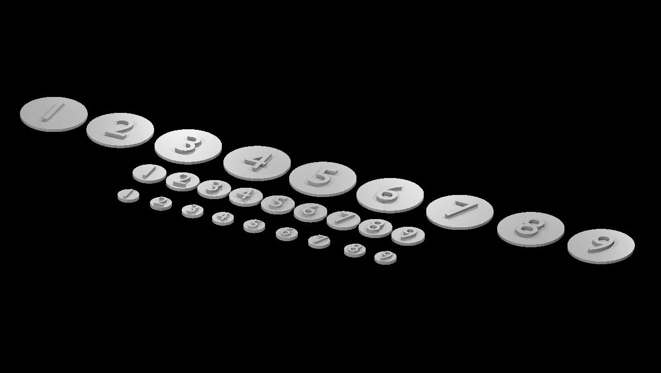 Lúc chơi mà không đủ minis, bạn có thể dùng mấy marker kích thước có đánh số này làm placeholder. Giải pháp đơn giản để thay thế tạm thời, vẫn dễ phân biệt size trên bàn chơi.
