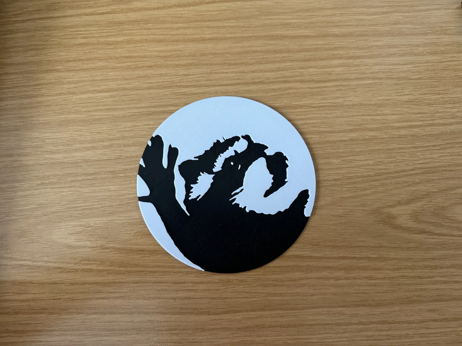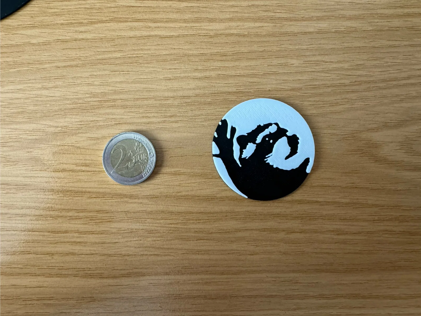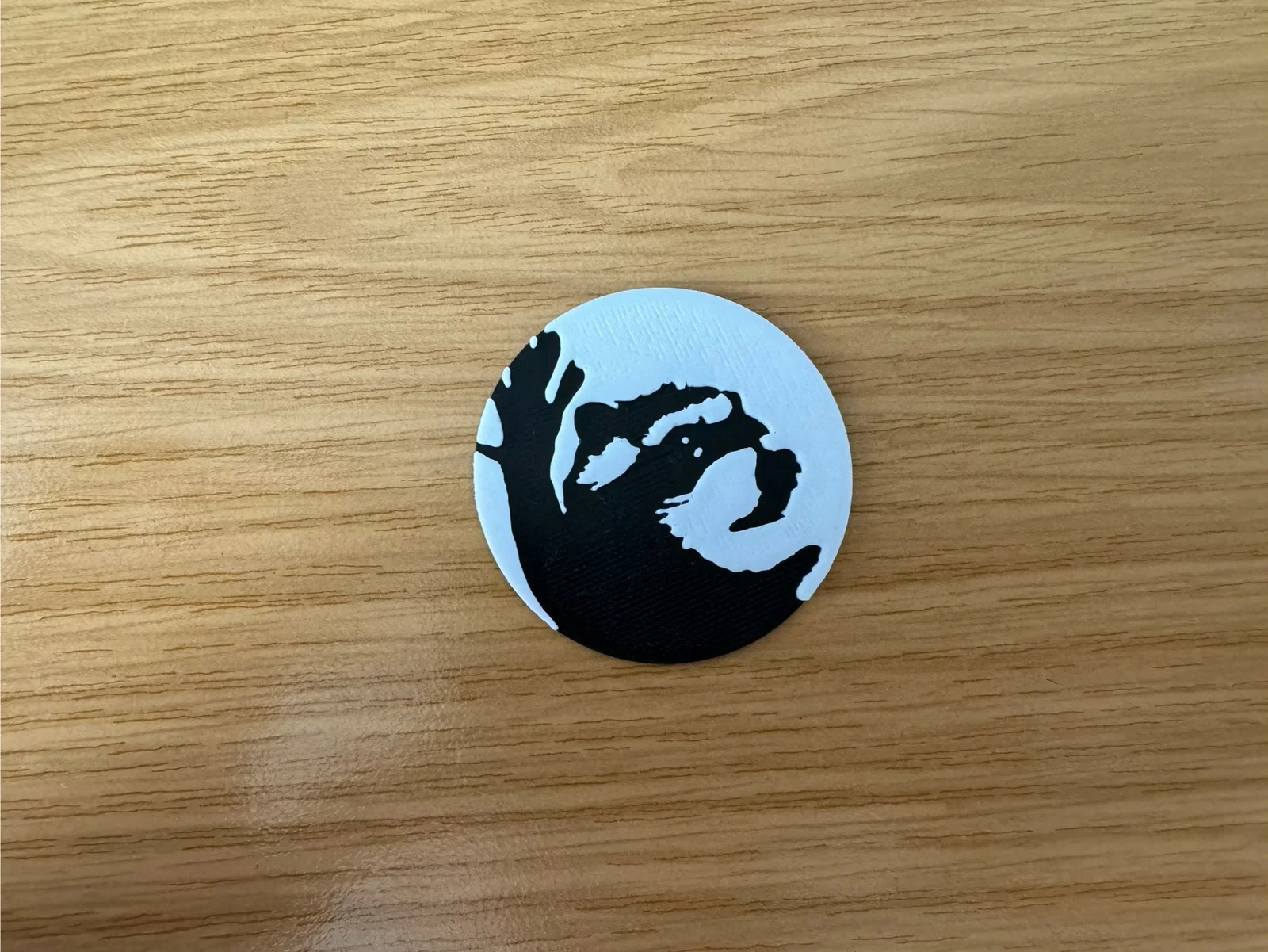 Mẫu Pedro Racoon 2D Plate gồm 2 file: bản lớn 130mm x 2mm và bản nhỏ 50mm x 2mm. Filament swap ở Layer 6 với Bambu Lab PLA Basic White/Black. Lưu ý không nên mỏng hơn 2mm để tránh lộ màu đen.
