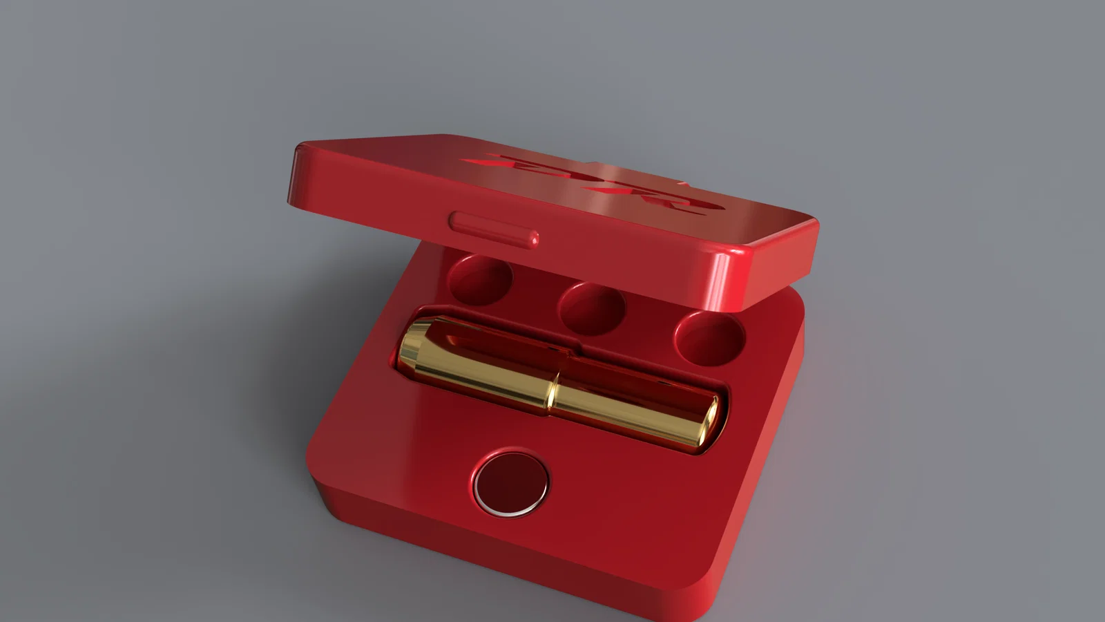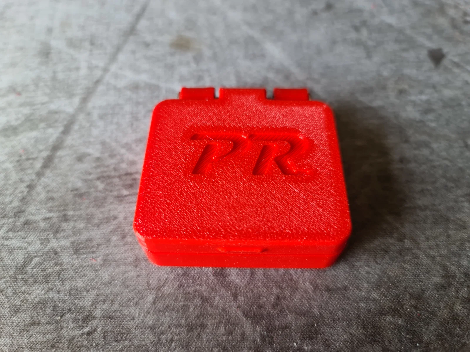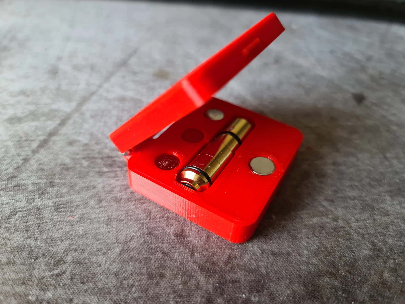 Hộp đựng cho Pink Rhino Laser Cartrige 9mm dùng tập dry-fire tại nhà, tách riêng cartridge và pin. Dùng 2 nam châm 8x3mm để đóng nắp và 1–2 ốc M3 làm bản lề. Có miếng đáy lỗ lớn hơn 0.2 để dễ canh dung sai.