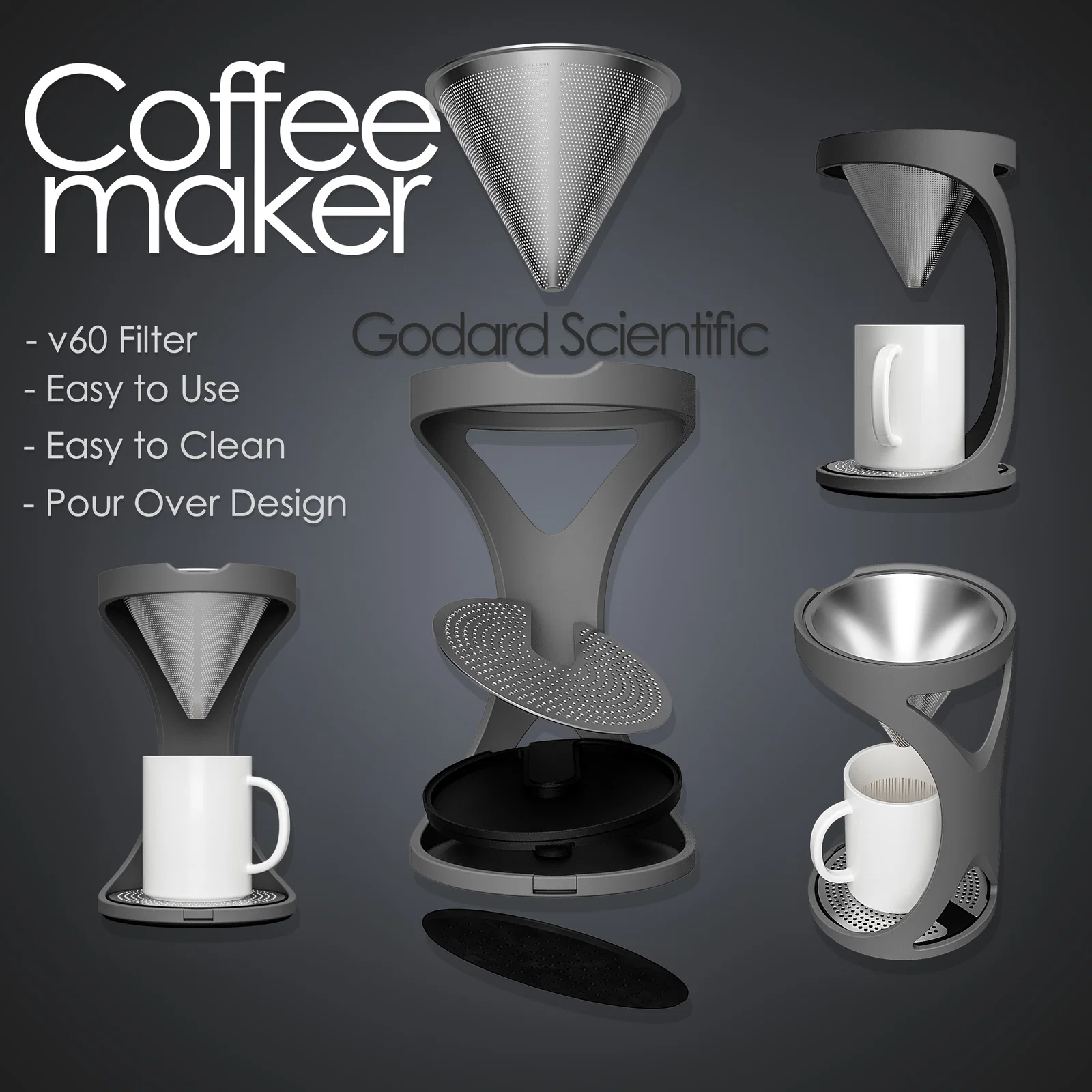 Mẫu Pour Over Coffee Maker in 3D tương thích filter V60. Khuyến nghị dùng vật liệu chịu nhiệt tốt cho catch grill/plate, tăng wall 4–6 lớp để hạn chế biến dạng. Foot in TPU dán chống trượt. Model chưa test.