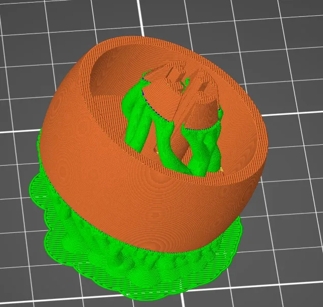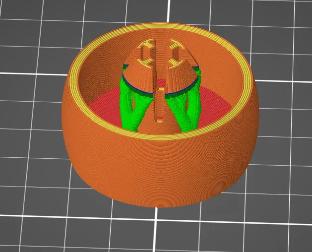 Bản in đầu tiên đã bị hỏng ngay lập tức vì nó làm gãy một phần mỏng theo hướng của lớp, vì vậy tôi đã thêm một cấu trúc gia cố. Tuy nhiên, tôi nghĩ rằng kết quả tốt hơn về độ bền có thể đạt được bằng cách in bánh xe trên bề mặt được xoay khoảng 30° để lực lớp không được áp dụng theo hướng ngang.
