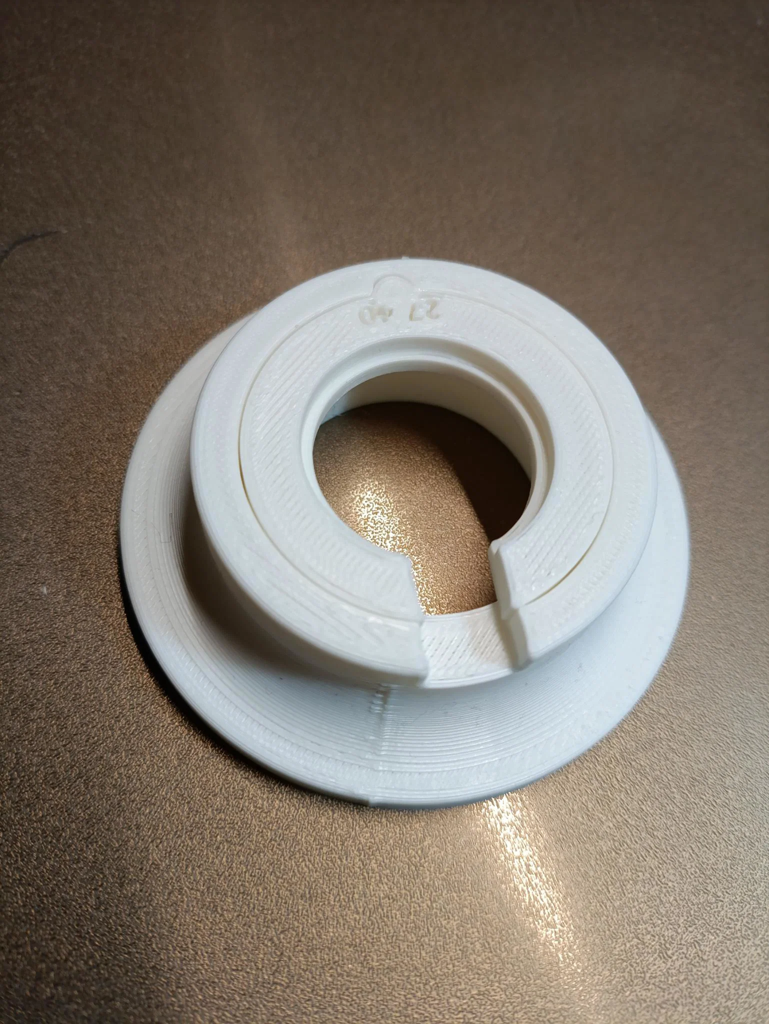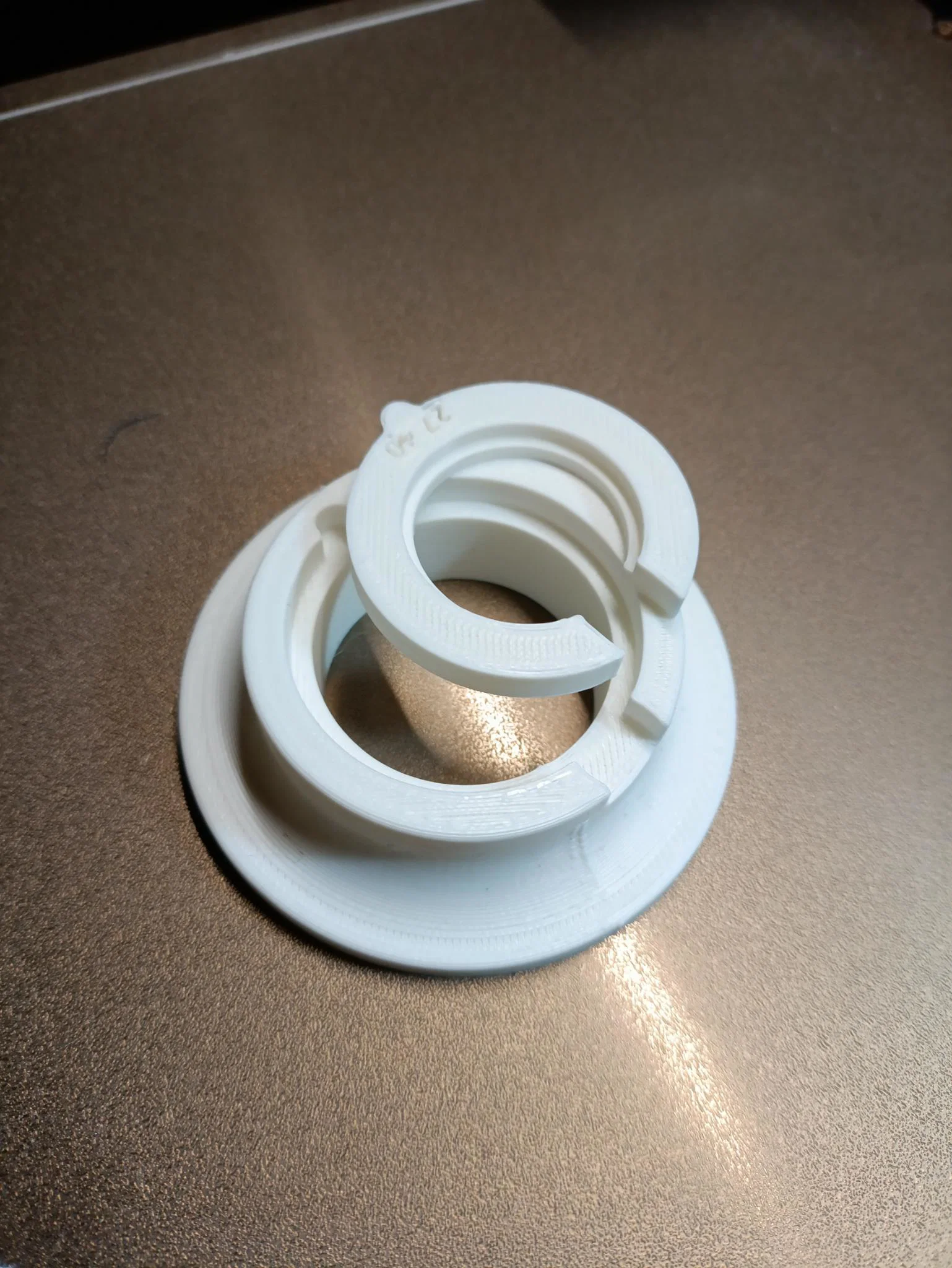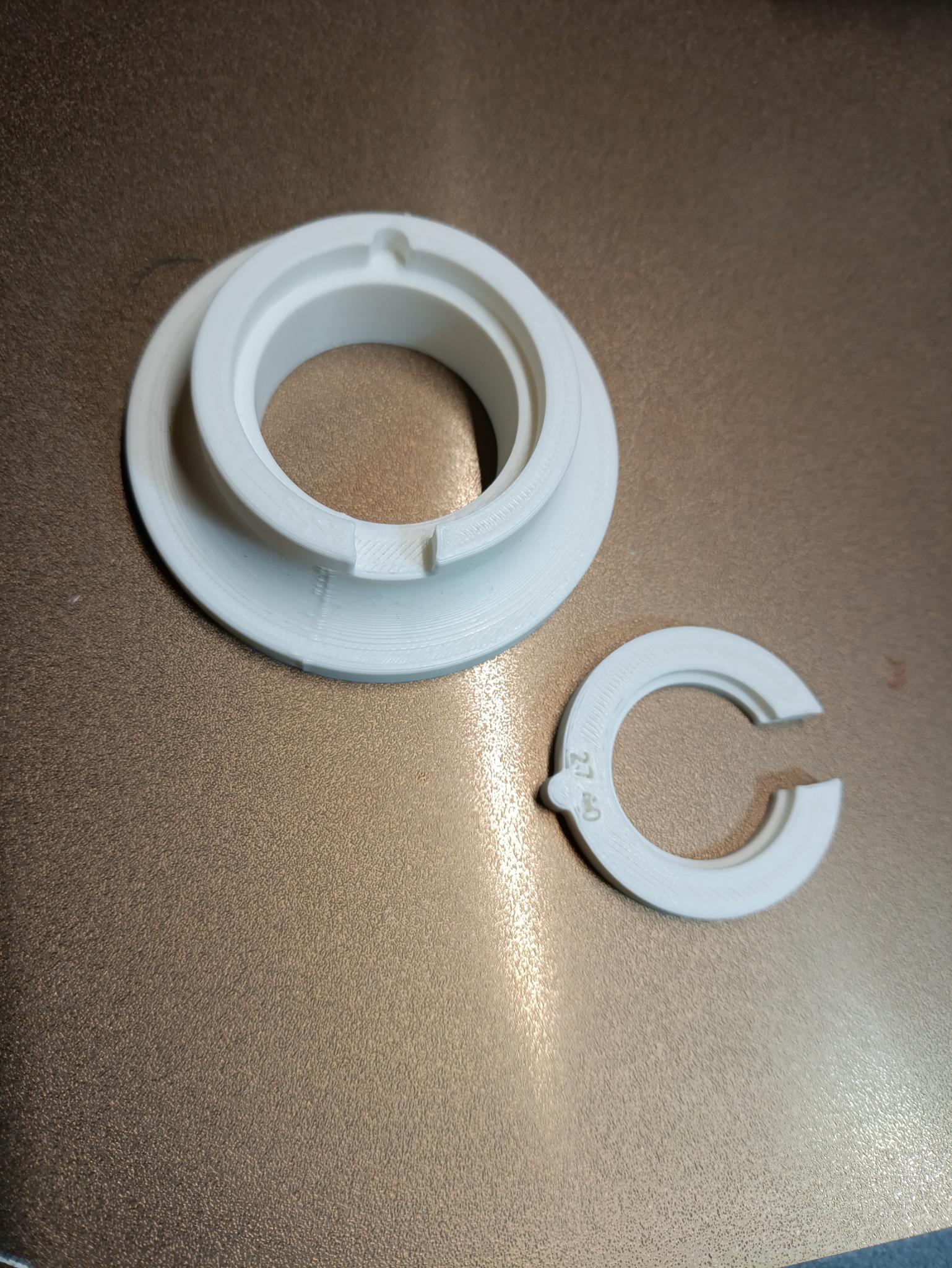 In 1 base dùng chung, rồi in các insert ring theo từng đường kính ngoài (OD) của movement. Nhập OD trong FreeCAD để tạo ring khớp, có in sẵn size trên ring. Keyway khóa ring với base chống xoay, tiết kiệm thời gian in và filament.