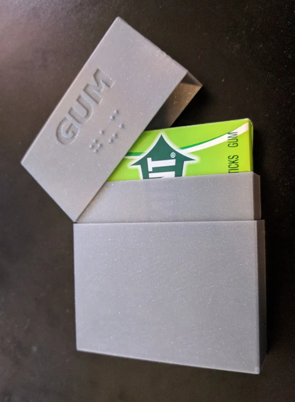 Một hộp kẹo cao su đơn giản phù hợp với các gói kẹo cao su Wrigleys. Nó bảo vệ bao bì và giúp ngăn kẹo cao su không bị hỏng quá nhanh. Nắp được ghi nhãn ở cả hai mặt và các điểm nắm là từ “gum” bằng chữ nổi. Nắp được thiết kế để vừa khít với đáy để không bị rơi ra khi cầm ngược.