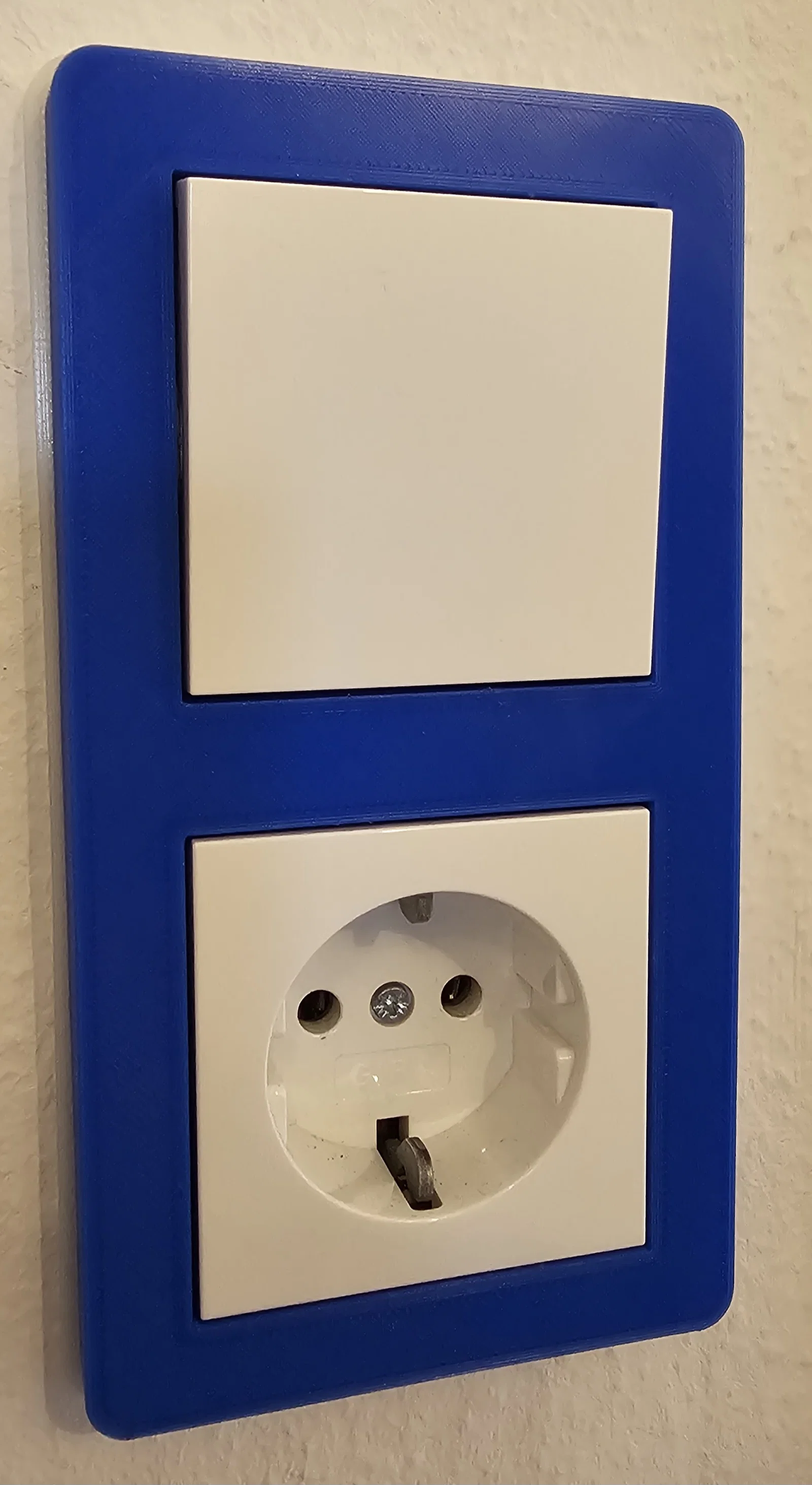 Mẫu khung GIRA System 55 Standard 2-Compartment Frame (v2), tương thích Gira System 55. Khuyến nghị in PETG: layer 0.2mm, nozzle 0.4mm, cần supports, đặt bề mặt nhìn thấy úp xuống bàn in.
