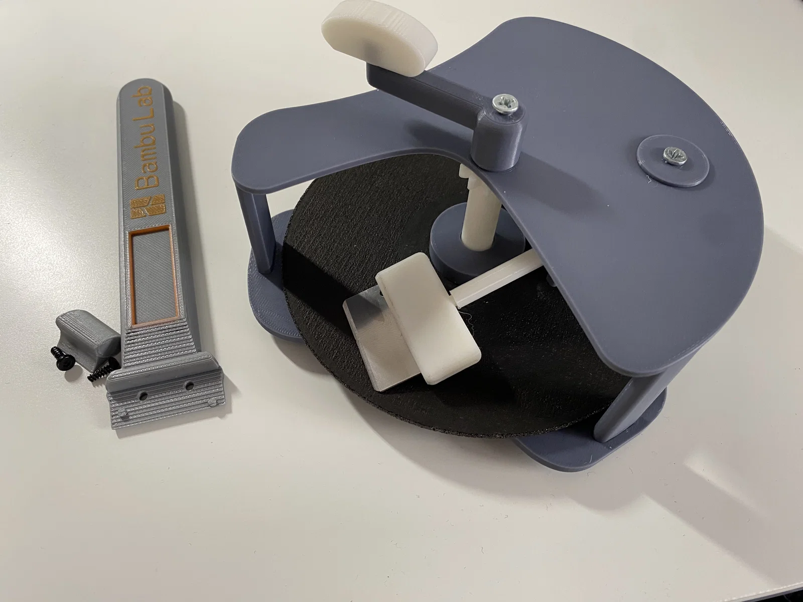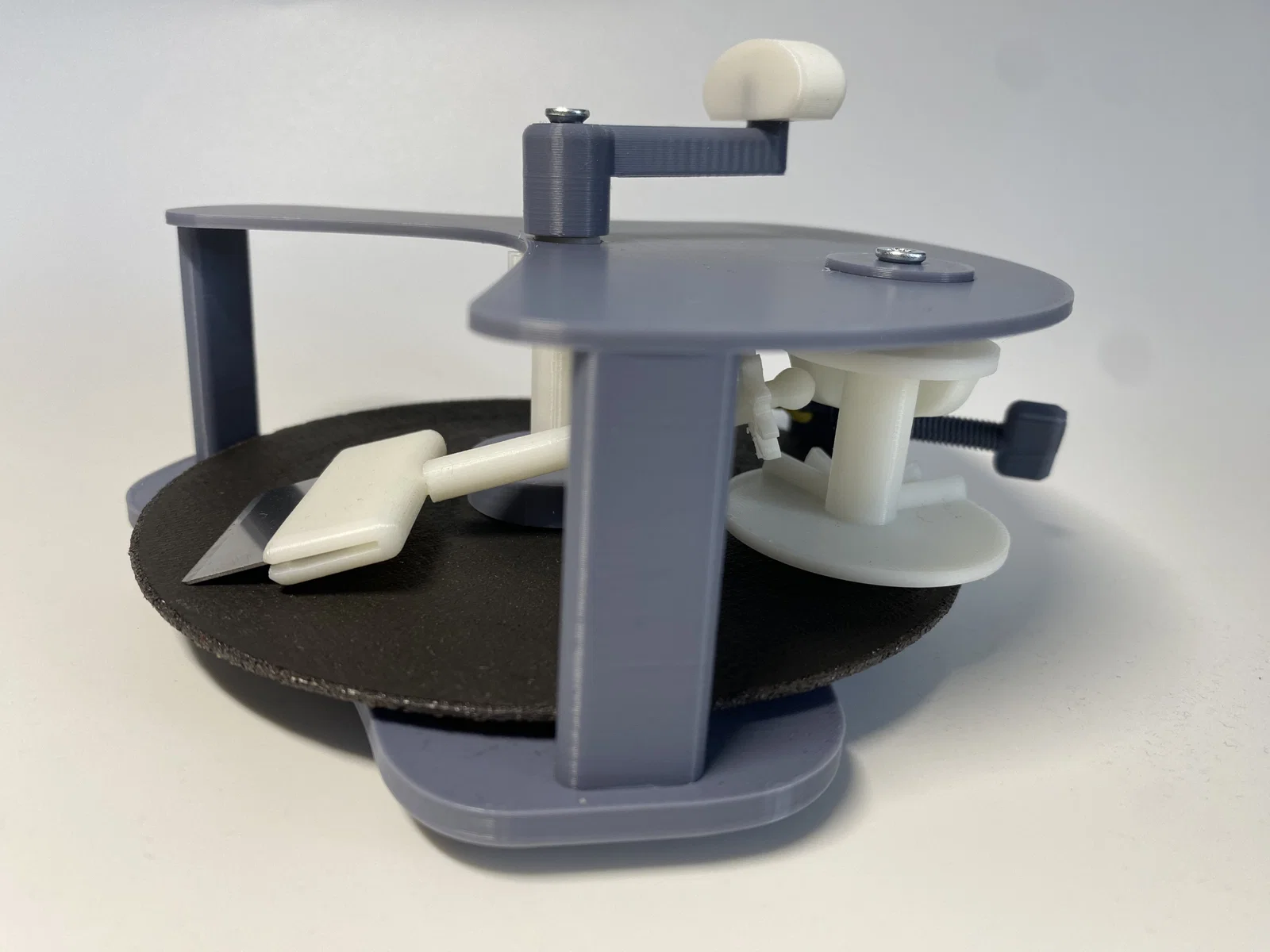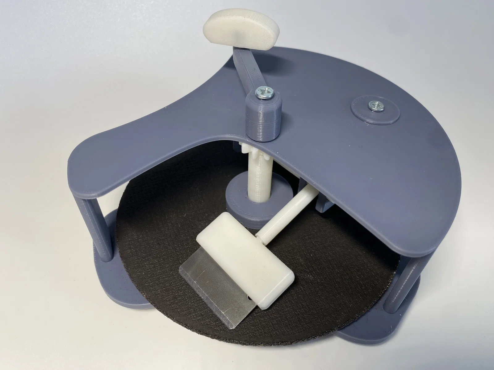 Đồ mài dạng xoay cho lưỡi dao/cây cạo: dùng cho Bambu scraper, lưỡi dao cạo truyền thống hoặc lưỡi cạo bếp. Hỗ trợ lưỡi tối đa khoảng 25x45mm, dùng đĩa angle grinder 125mm và cần dây cao su + 2 vít M4x10mm.