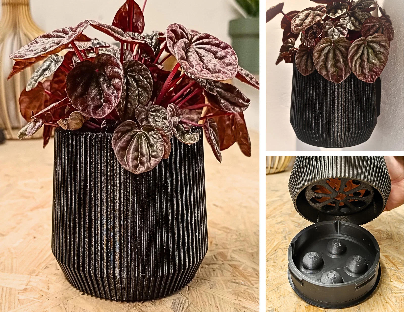 Wall Planter 1.13 là chậu trồng cây có khay thoát nước ẩn và tuỳ chọn ngàm/giá treo tường. In dễ, không cần Supports; gợi ý 8% Infill với Gyroid. Filament mẫu dùng Redline màu đen-kim tuyến vàng.