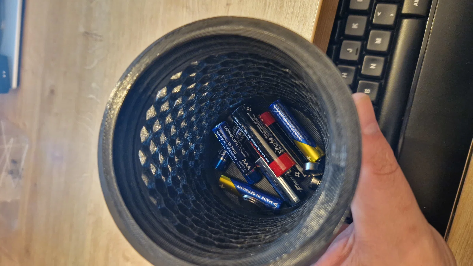 Hộp trong suốt để chứa pin đã dùng, phù hợp nhiều cỡ pin phổ biến như LR44, CR2032, R3, R6, R9. Thiết kế gồm 3 phần với nắp trong và nắp ngoài vặn ren; nắp ngoài có thể lắp để khóa lỗ nạp khi mang đi.
