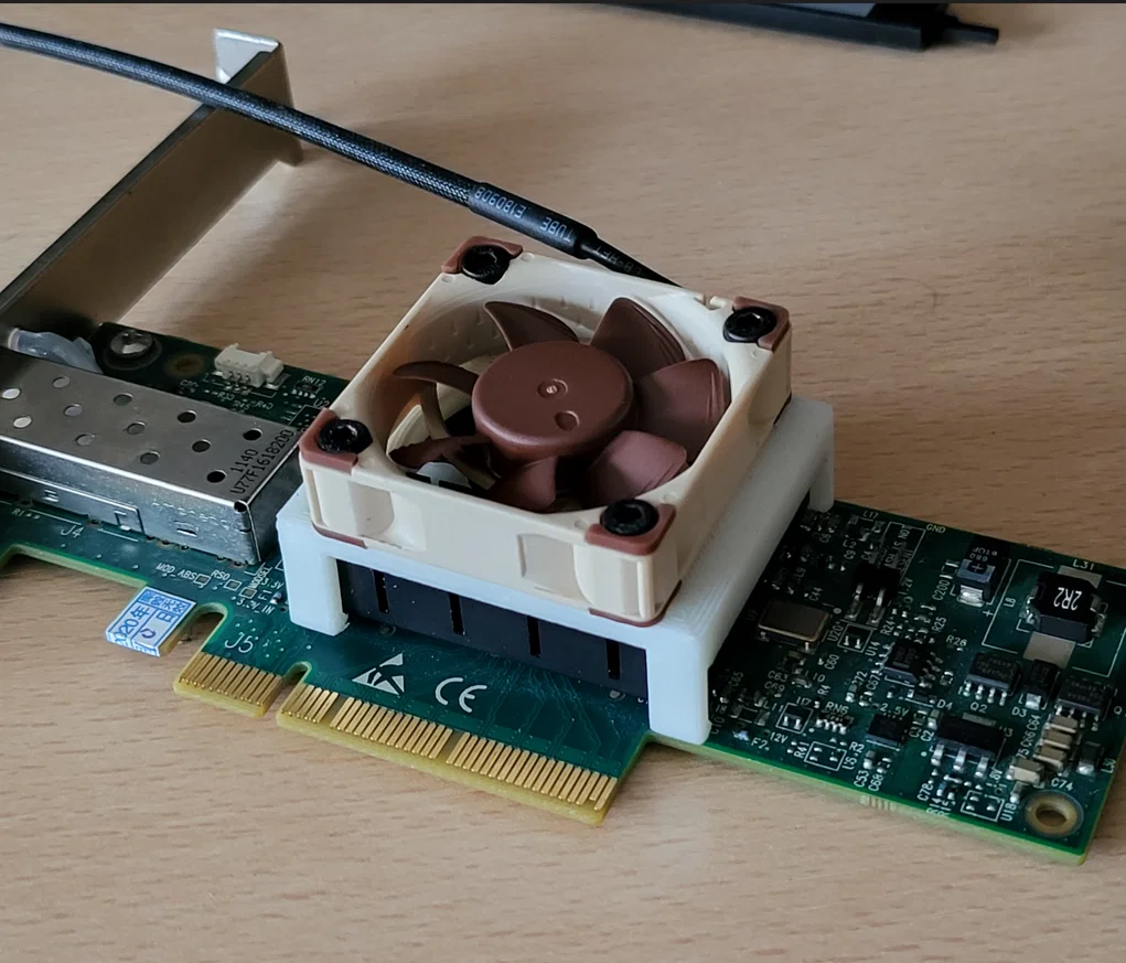 Một cái fan bracket đơn giản để giữ quạt 40mm cố định, ép sát vào heatsink của Mellanox ConnectX-2.