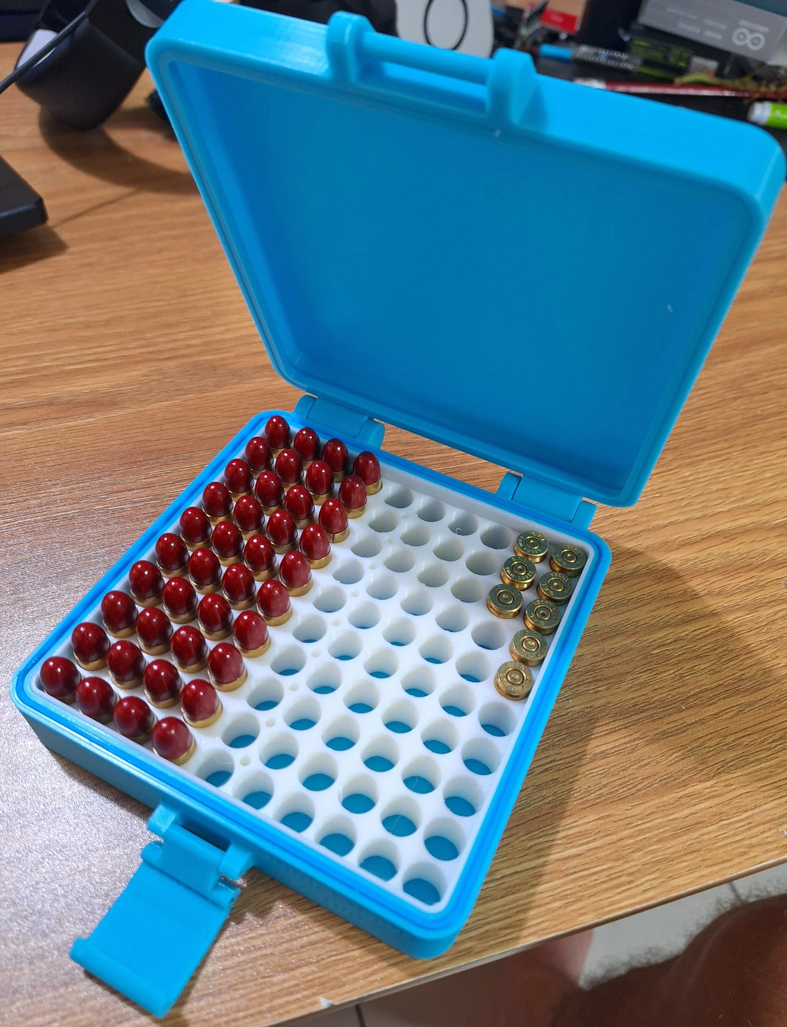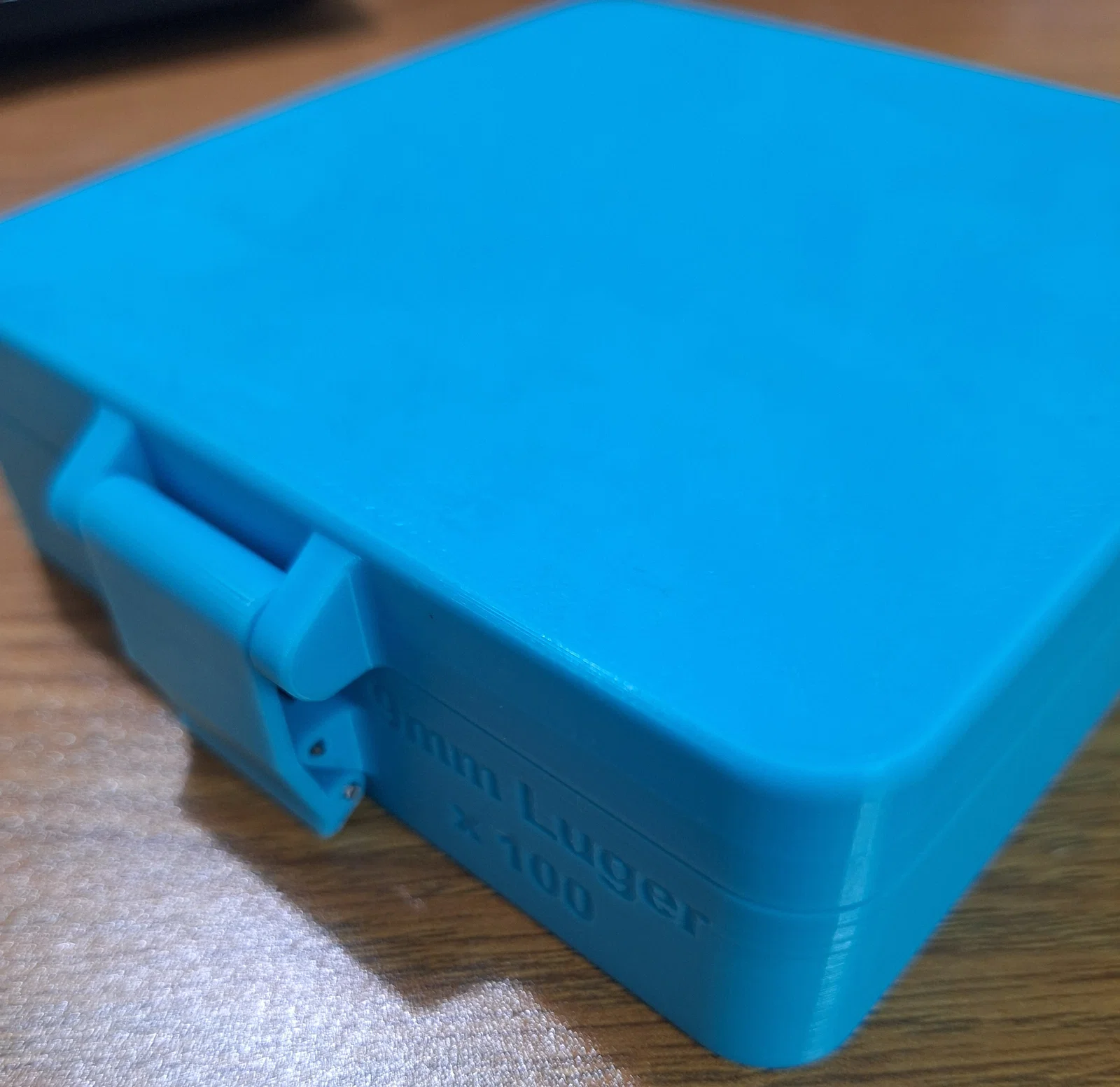 Đây là hộp đạn 9mm bản 100 viên của mình. Mình làm mẫu này để giới thiệu cụm bản lề (hinge assembly) mới, và do kích thước nên mình phải in phần đế (base) và nắp (lid) tách riêng. Bạn sẽ thấy bản lề demo của mình (màu cam) mình in ra để test thiết kế. Mình đã scale phần bản lề lớn hơn so với các thiết kế trước để tăng độ cứng/độ bền cho cụm lắp ráp.
