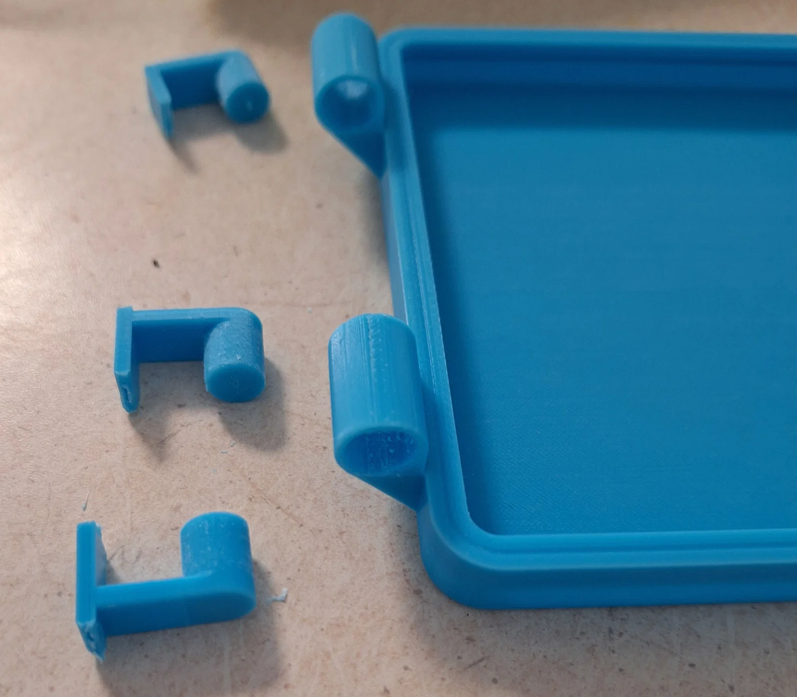 Mình cũng có chụp hình nắp theo từng giai đoạn, kèm theo ảnh các món phụ kiện bạn sẽ cần để hoàn thiện các phần chuyển động. Mình đã thêm một số gân tăng cứng (stiffeners) cho phần insert vì mình không hài lòng với bản in đầu tiên. Ảnh của hộp vẫn đang gắn insert của lần in đầu tiên vì nó vẫn dùng ổn. Mình cũng hạ thấp insert so với hộp 9mm đầu tiên mình làm, vì vỏ đạn đã bắn (spent shells) hay bị lọt và kẹt trong insert.