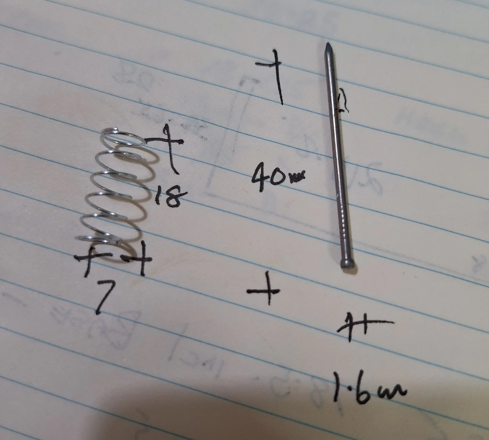 Lò xo dài 18mm x đường kính 7mm, bề dày sợi (section thickness) 0.5mm. Các chốt trục (shafts) cho cụm lẫy khóa (latch assembly) dùng đinh hoàn thiện (finish nails) 1.6mm (1/16" x dài 1-1/2"), bạn sẽ phải cắt (clip) lại cho đúng chiều dài.