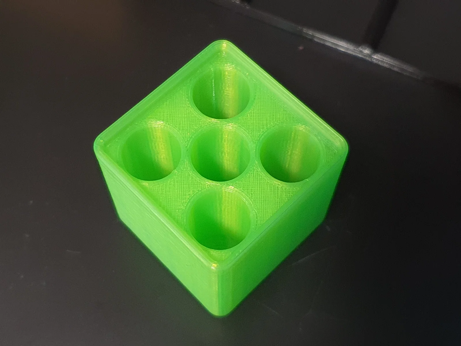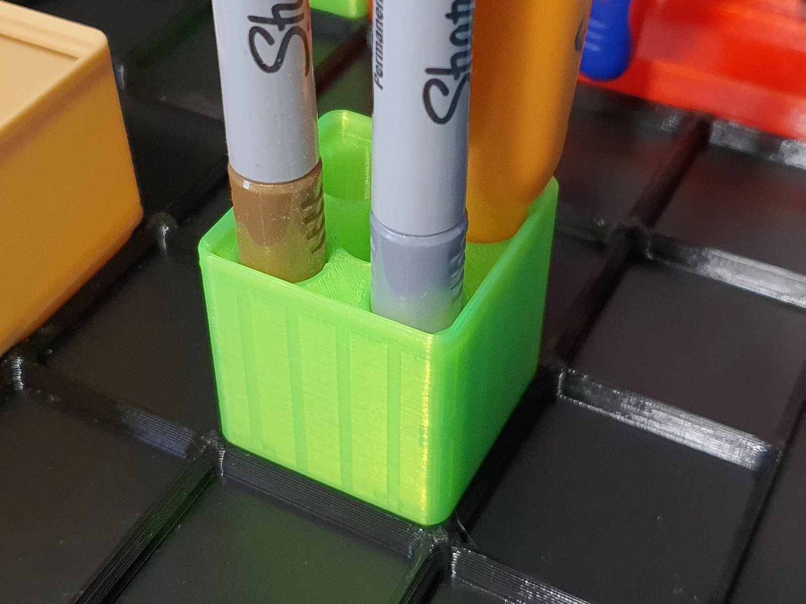 Khối lưu trữ Sharpie theo chuẩn Gridfinity dành cho người thích để đầu bút chúc xuống để giữ mực bão hòa tốt hơn. Bản V2 có khoét hai bên để bút/Sharpie có kẹp túi cũng vừa với 4 ô giữ.