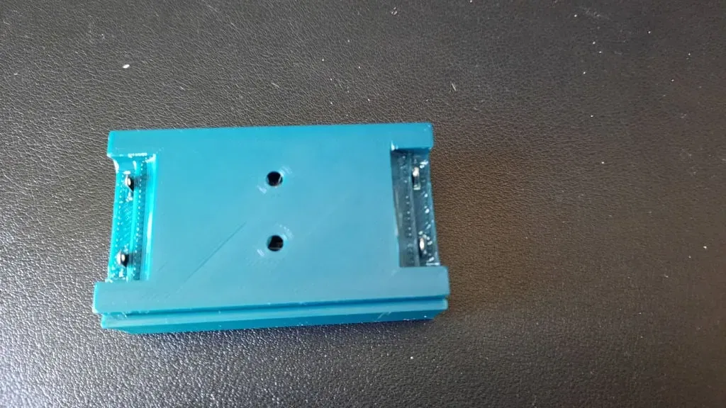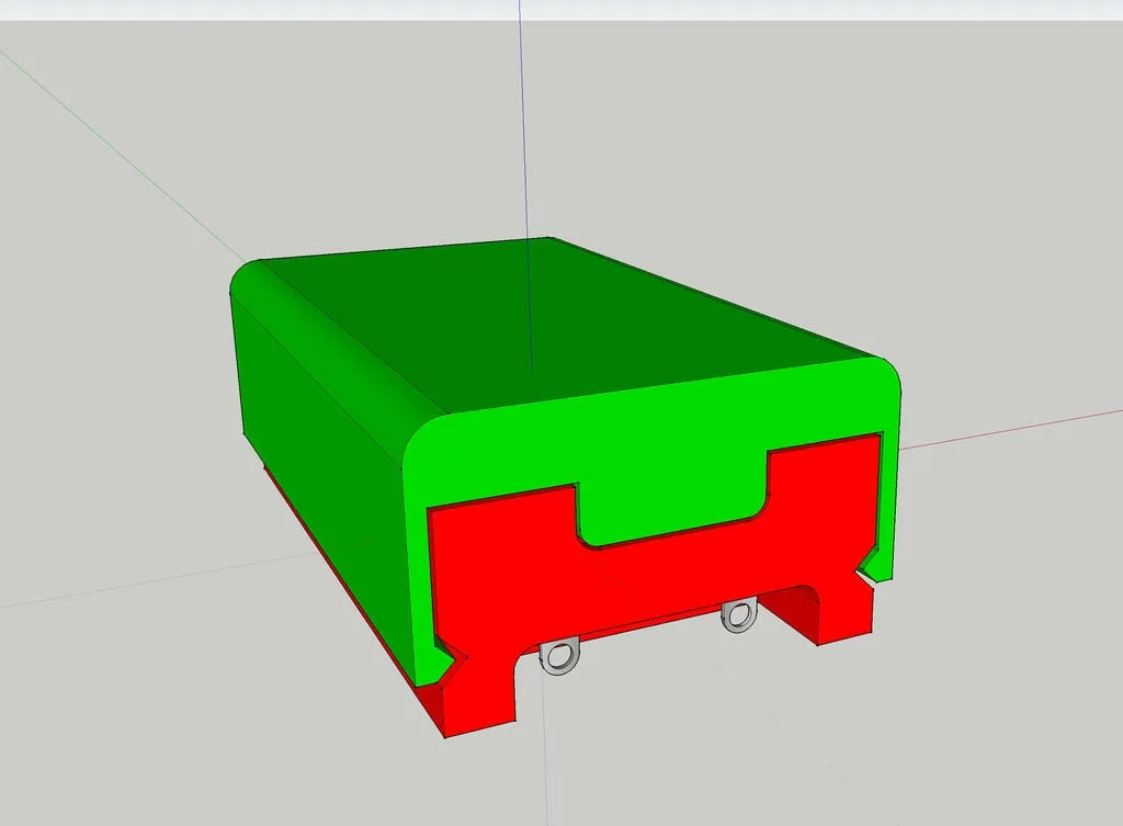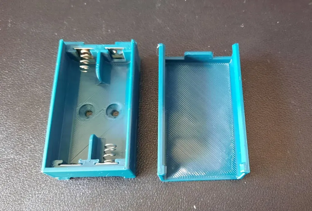Một bộ pin hai AA đơn giản, với nắp tùy chọn có thể trượt lên, và hai lỗ gắn chìm. Nó sử dụng những thẻ tiếp xúc vuông nhỏ generic được tìm thấy trên eBay, Amazon, v. v. , nơi bạn có thể mua 10 bộ với giá khoảng hai bảng. Nắp trên phiên bản này chỉ có thể được trượt lên và xuống từ một đầu. Nó bị ngăn không cho đi theo cả hai chiều bởi một cái vây nhỏ trong nắp (với một rãnh tương ứng trong thân chính). Đối với những ai cần một nắp có thể trượt theo cả hai hướng, hãy xem thiết kế khác của tôi: