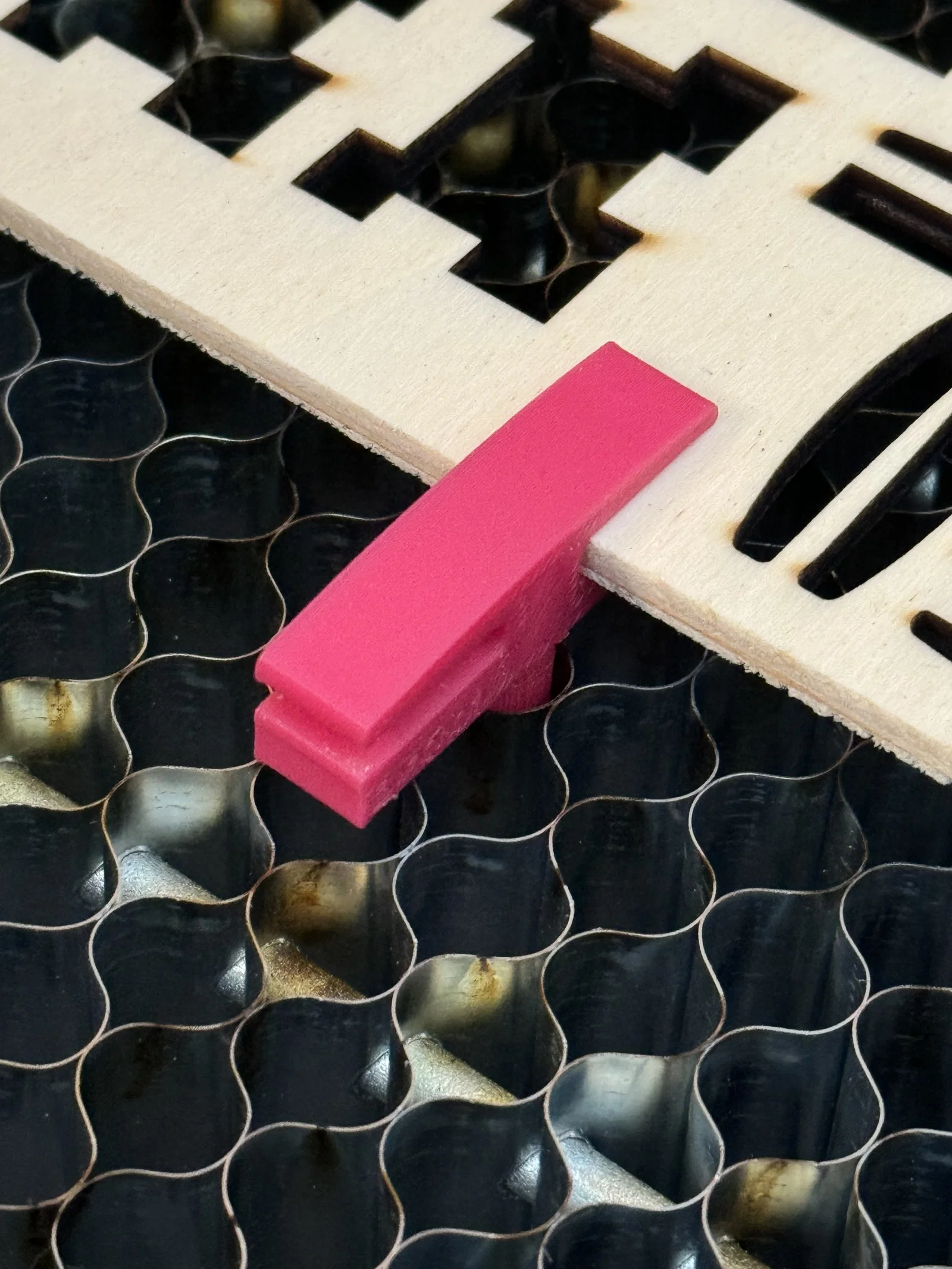 Cắm vào tấm Wabenplatte (Honeycomb), rồi đặt ván ép dày 3 hoặc 4mm vào. Nhờ vậy, tấm gỗ không nằm trực tiếp trên Honeycomb và phần vật liệu sau khi cắt sẽ rơi xuống ngay. Bạn sẽ nhìn ra liền đường cắt có ổn không, đồng thời giảm bớt vết cháy ám (smoke marks) ở mặt sau.