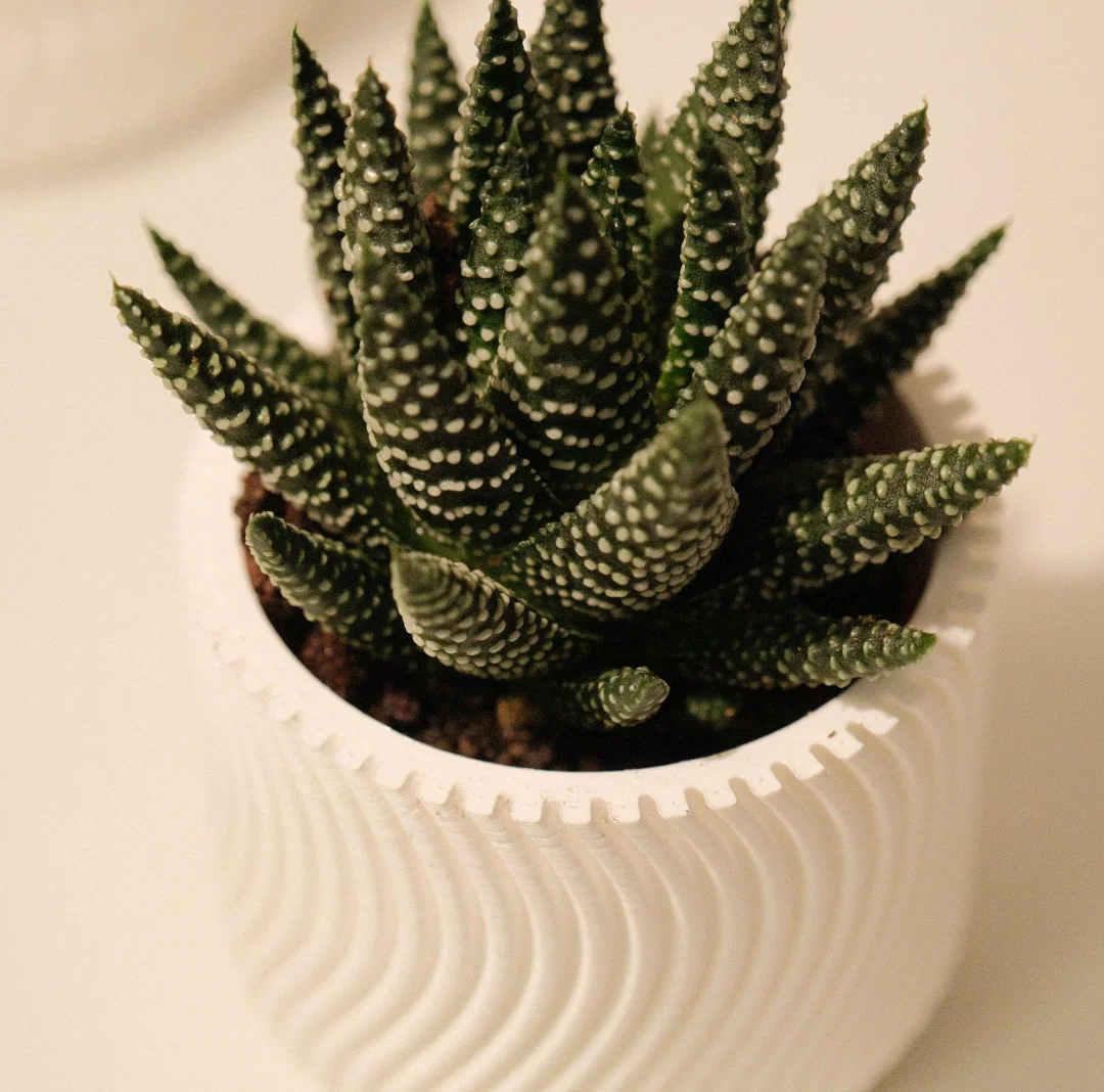 Là một phần trong bộ sưu tập Wavy của mình, chậu cây này mang phong cách sạch sẽ và tối giản để trưng bày sen đá và các loại cây nhỏ. Nên in bằng PETG hoặc vật liệu chống thấm nước tương tự. Đây là chậu ngoài không có lỗ thoát nước, thiết kế để dùng kèm với một chậu trong.