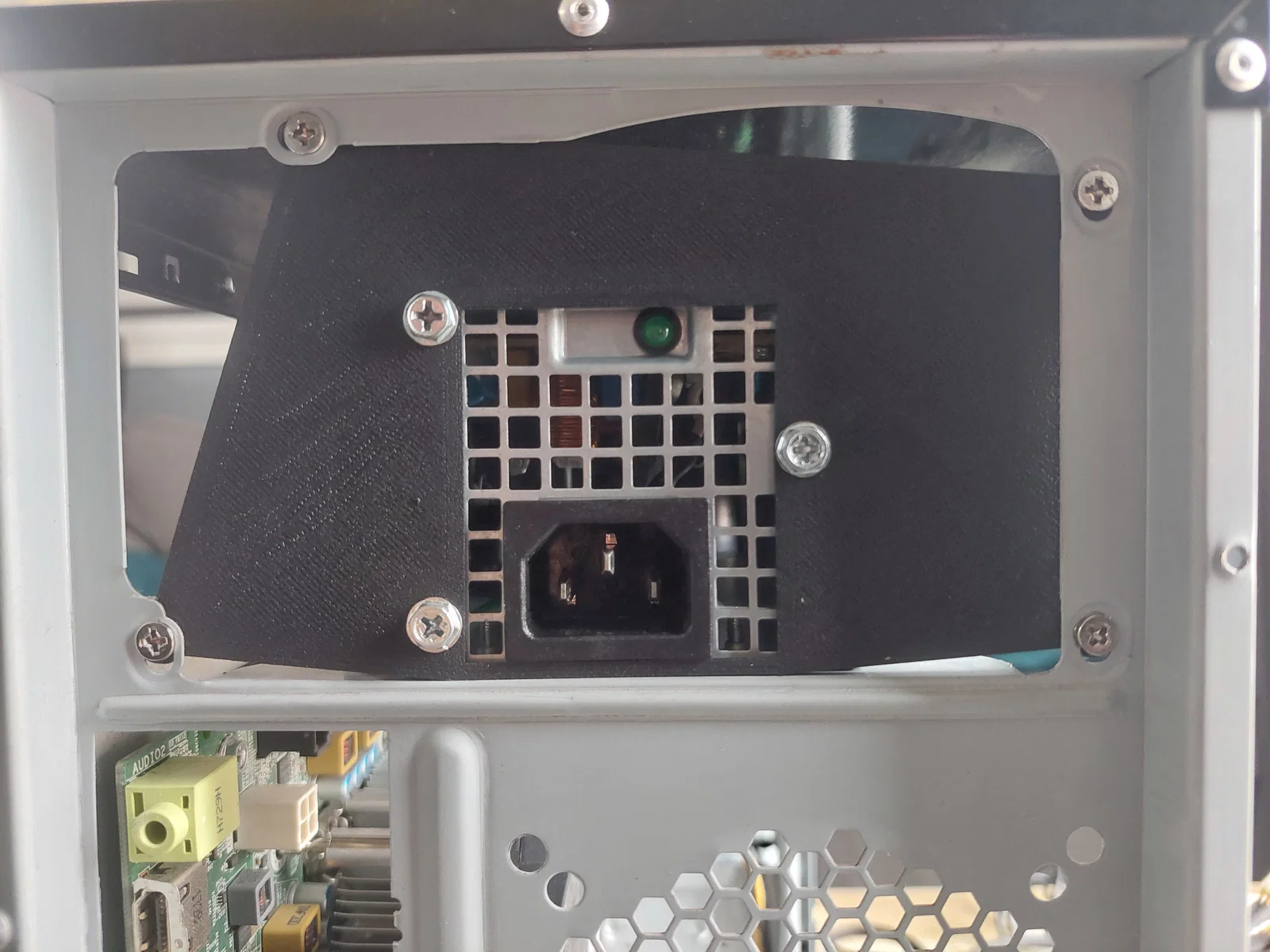 Dùng 4 vít 6-32 (vít PSU ATX tiêu chuẩn) vặn trực tiếp vào tấm adapter, và có thể tận dụng lại vít của PSU Dell để bắt PSU lên tấm. Lưu ý bạn cần khoảng ~23 cm khoảng trống để lắp vừa PSU trong case.